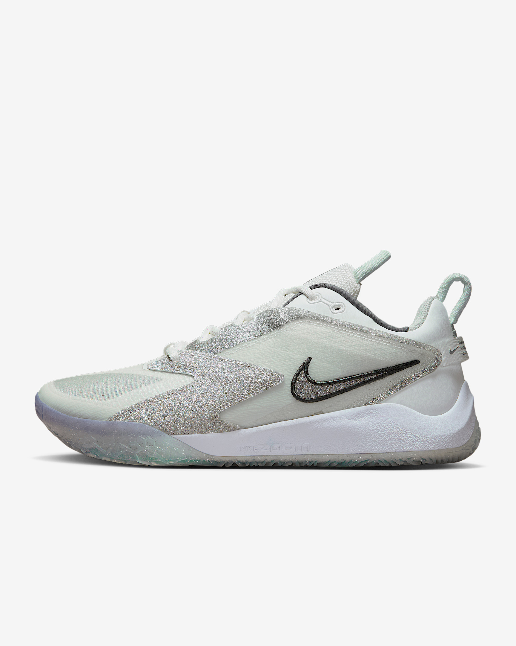 Made for the all-out hustlers who refuse to give up on any play, the HyperAce 3 has you ready for your match. Its sleek, quick design is perfect for instant-reaction plays, cat-quick digs and scurrying into position for a bump. An updated outsole and Air Zoom cushioning blend with an agile, lightweight build to help you lunge and last all-match long. With vibrant colors throughout, this version's design adds a pop to your match-day look. More Benefits - An internal webbing system helps secure your foot into the shoe once you lace up. - The collar is plush and supportive to help keep your ankle and heel from rolling. Product Details - Shown: Summit White/Pure Platinum/Metallic Silver - Style: HF3239-101
