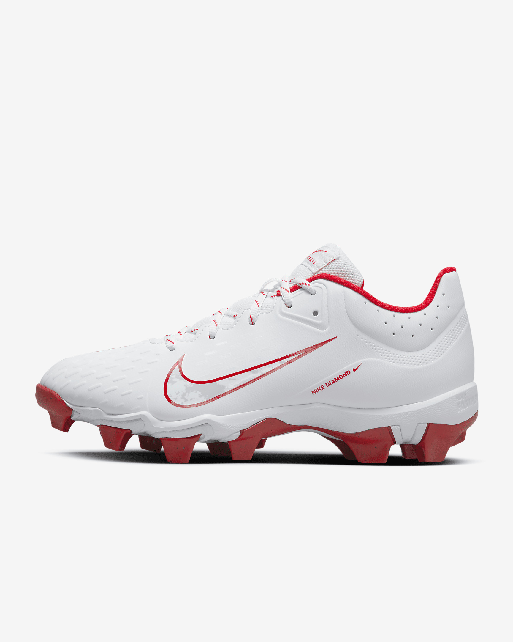 The Nike Hyperdiamond 4 Keystone is all about lightweight comfort on the diamond. Molded details on the upper add durability, while a flexible rubber sole with studs helps give you traction throughout the game or practice. Benefits - Synthetic on the upper with molded details provides durable comfort. - Nike Fastflex technology lets the rubber outsole bend with your foot so you can move freely. Product Details - Foam midsole - 12-cleat configuration for traction - Shown: White/Pure Platinum/University Red - Style: FZ0920-104