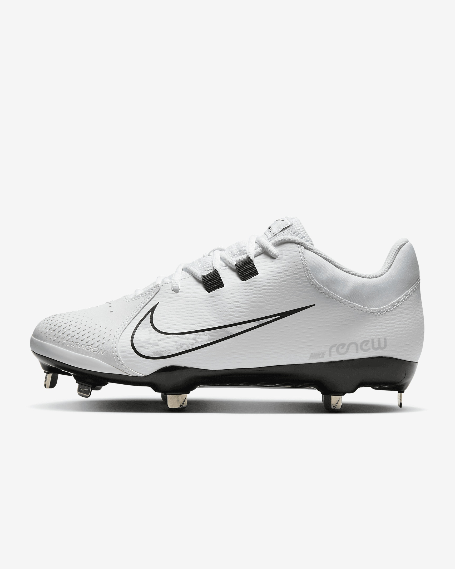 Be quick between the bases and nimble on defense in the Nike Hyperdiamond 4 Pro. Abrasion-resistant material on top and angular studs on the bottom work together to give you the durability and traction needed to help beat the relay throw just in time. Benefits - Nike Drag-On material on the forefoot is light and tough for extra durability. - Nike Renew foam provides soft cushioning for lasting comfort. - Eight angular studs set in a flexible, plastic plate gives you traction and stability. Product Details - Shown: White/Black/Wolf Grey - Style: FZ0922-101