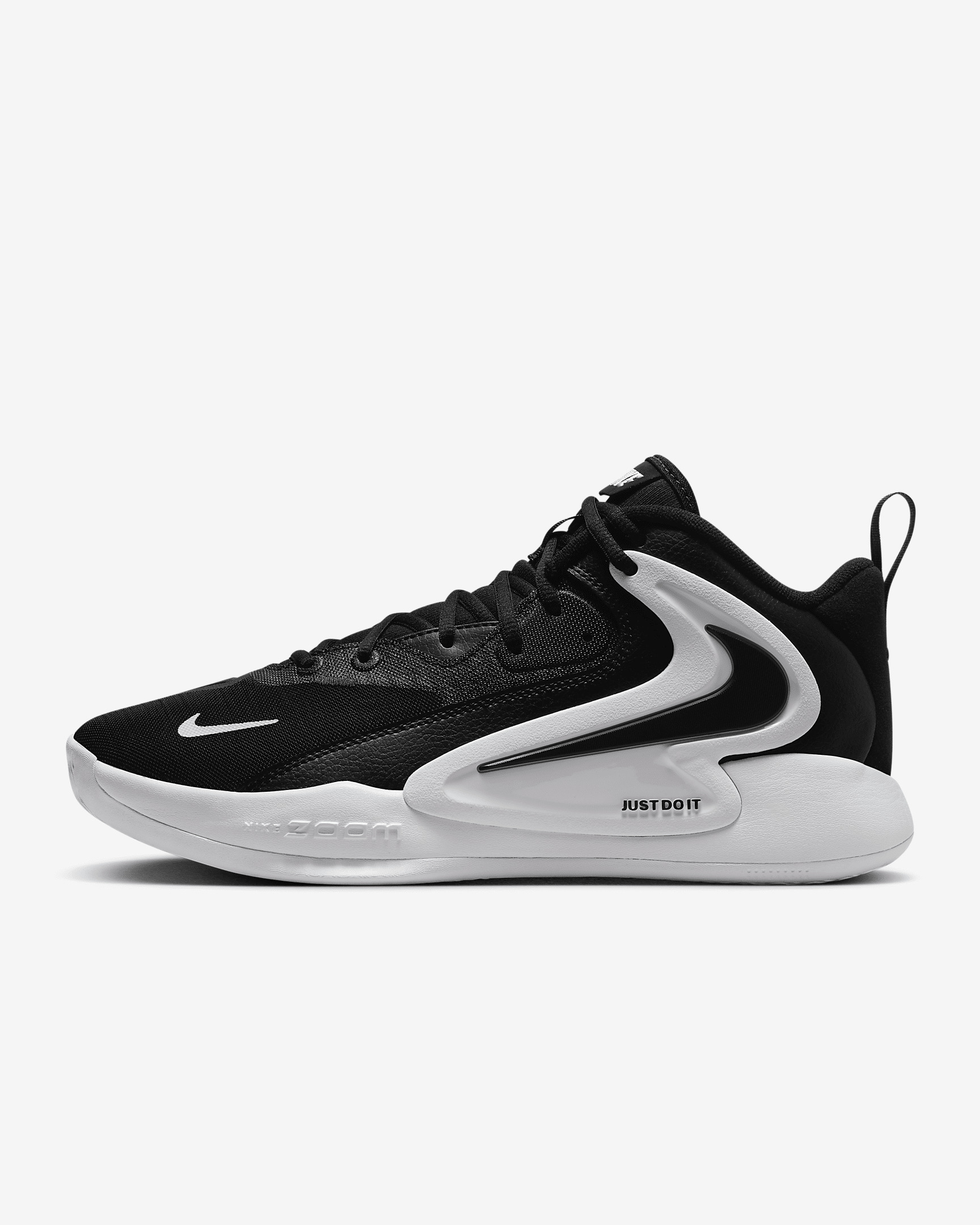 When the action heats up, stay in the middle of the fray with the Hyperset 2. A forefoot Air Zoom unit offers a unique pop when sprinting into position. You can attack at hyper speed without sacrificing comfort thanks to a foam midsole and lacing that helps keep you secure. Benefits - Snappy and responsive, Air Zoom cushioning helps provide a quick-off-the-ground sensation. - Mesh and synthetic leather with durable overlays offer breathable support. - Multidirectional traction gives you grip for netball, volleyball, badminton and other sports played on indoor courts. Product Details - Pull loops at heel and tongue - Rubber sole - Shown: Black/White/Black - Style: FQ7070-001