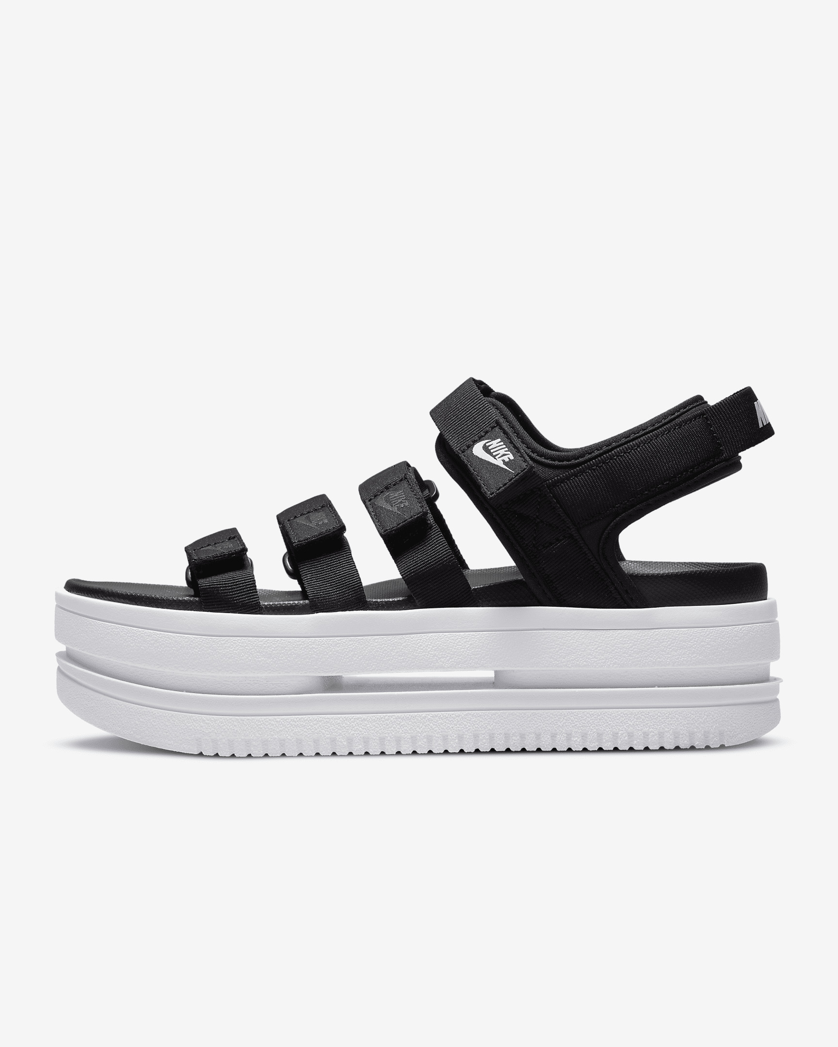 Lifted. Classic hoops detailing. Strappy but easy to wear. Check all the boxes in the Nike Icon Classic. Its big, bold midsole wows with comfort. The outsole pattern delivers iconic Air Force 1 vibes, while the multiple hook-and-loop straps add a fearless look. Get ready to shine with this new voice in sandal style. Benefits - Lifted midsole delivers the look you love with the comfort you expect. - Strappy upper features easy-to-adjust hook-and-loop closures that bring an innovative, fresh and fun look straight out of the box. - Classic Air Force 1 detailing on the outsole delivers heritage style, traction and durability. - Foam footbed adds to the comfort. Product Details - Forefoot height: 52mm. Heel height: 54.2mm - Shown: Black/White/White - Style: DH0224-001 SIZE & FIT Fits small; we recommend ordering a fl size up