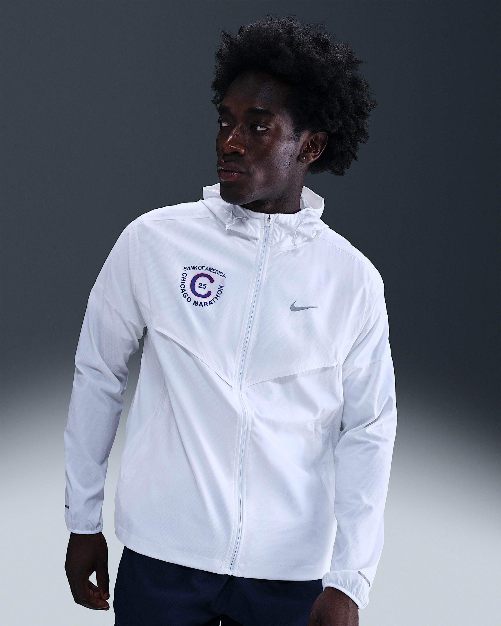 This ultralight jacket celebrates the Bank of America Chicago Marathon. It’s built for unpredictable weather, with a lightweight, water-repellent design that packs away when the skies clear. More Benefits - Mesh panels under the arms provide extra breathability. - Zippered pockets allow you to securely store essentials. Product Details - Full-length zipper - Hood with a bungee cord - Reflective Swoosh - Reflective elements - Body: 93% polyester/ 7% spandex. Mesh: 100% polyester. - Machine wash - Imported - Not intended for use as Personal Protective Equipment (PPE) - Shown: White/Deep Night - Style: HQ4267-100 SIZE & FIT Model is wearing size M and is 6′0″183cm Standard fit: easy and traditional