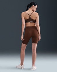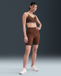 Don't let anything get in the way of expressing yourself in this sleek, low-profile sports bra. Its light support gives you a gentle hold with plenty of freedom that's great for low-impact workouts or all-day comfort. Smooth, quick-drying fabric gives the bra a clean finish so you can wear it your way. More Benefits - Nike Dri-FIT technology moves sweat away from your skin for quicker evaporation, helping you stay dry and comfortable. - Soft jacquard chest band sits snugly against your skin without pinching or binding. Product Details - Body: 78-79% polyester/21-22% spandex. Bottom hem: 53% polyester/28% nylon/19% spandex. Straps: 52% polyester/32% spandex/16% nylon. Lining: 84% polyester/16% spandex. Interlining: 80% polyester/20% spandex. Pad top fabric/Pad back fabric: 100% polyester. Pad: 100% polyurethane. - Machine wash - Imported - Shown: Fauna Brown - Style: FD1062-265 SIZE & FIT Model is wearing size S Model height: 5′10″178cm Model bust: 34″86cm Tight fit: snug and form-fitting Light support: feels ke a soft hug with plenty of freedom