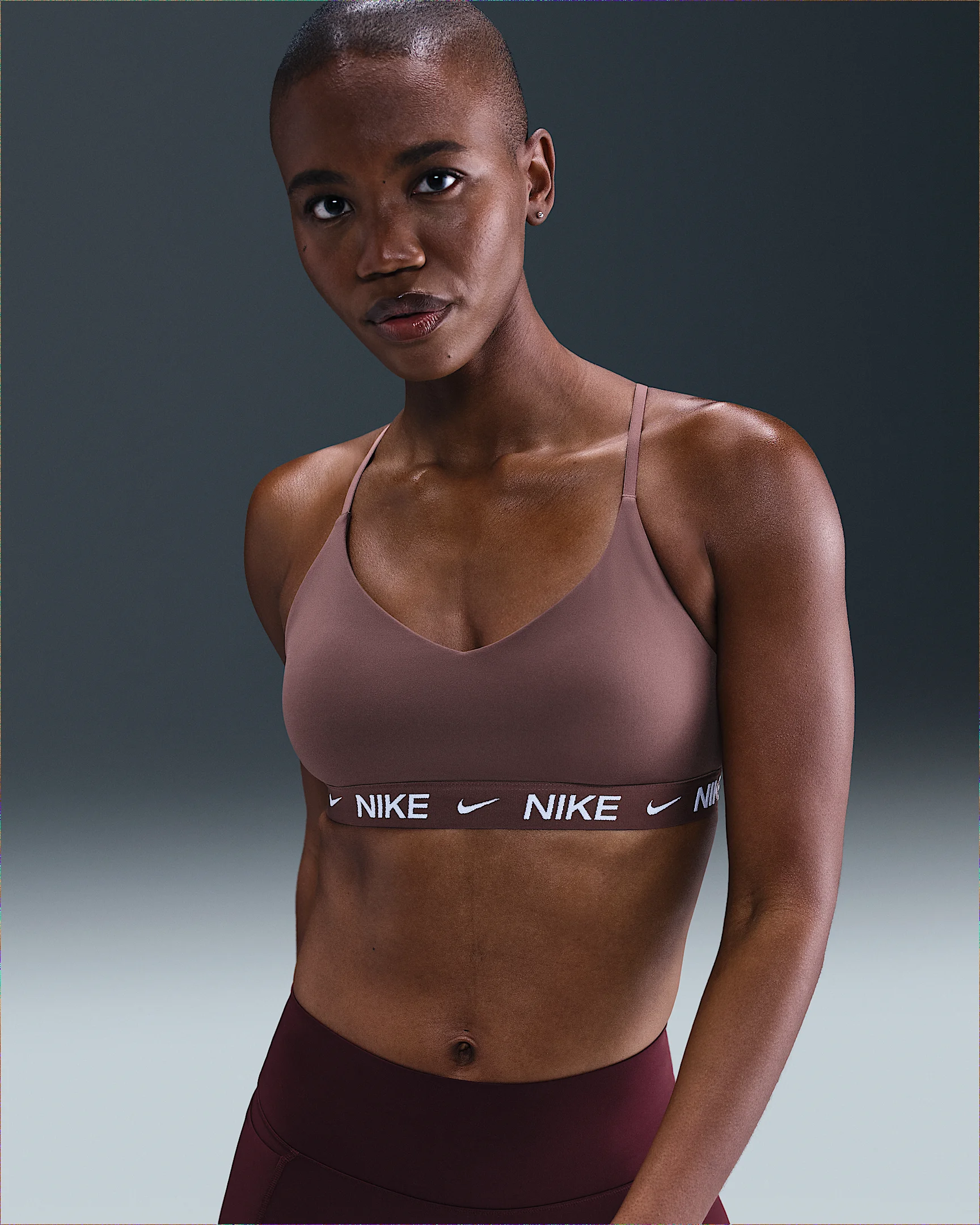 Don't let anything get in the way of expressing yourself in this sleek, low-profile sports bra. Its light support gives you a gentle hold with plenty of freedom that's great for low-impact workouts or all-day comfort. Smooth, quick-drying fabric gives the bra a clean finish so you can wear it your way. More Benefits - Nike Dri-FIT technology moves sweat away from your skin for quicker evaporation, helping you stay dry and comfortable. - Soft jacquard chest band sits snugly against your skin without pinching or binding. Product Details - Body: 78-79% polyester/21-22% spandex. Bottom hem: 53% polyester/28% nylon/19% spandex. Straps: 52% polyester/32% spandex/16% nylon. Lining: 84% polyester/16% spandex. Interlining: 80% polyester/20% spandex. Pad top fabric/Pad back fabric: 100% polyester. Pad: 100% polyurethane. - Machine wash - Imported - Shown: Tattoo/Tattoo/White - Style: FD1062-502 SIZE & FIT Model is wearing size M and is 5'11"180cm Tight fit: snug and form-fitting Light support: feels ke a soft hug with plenty of freedom