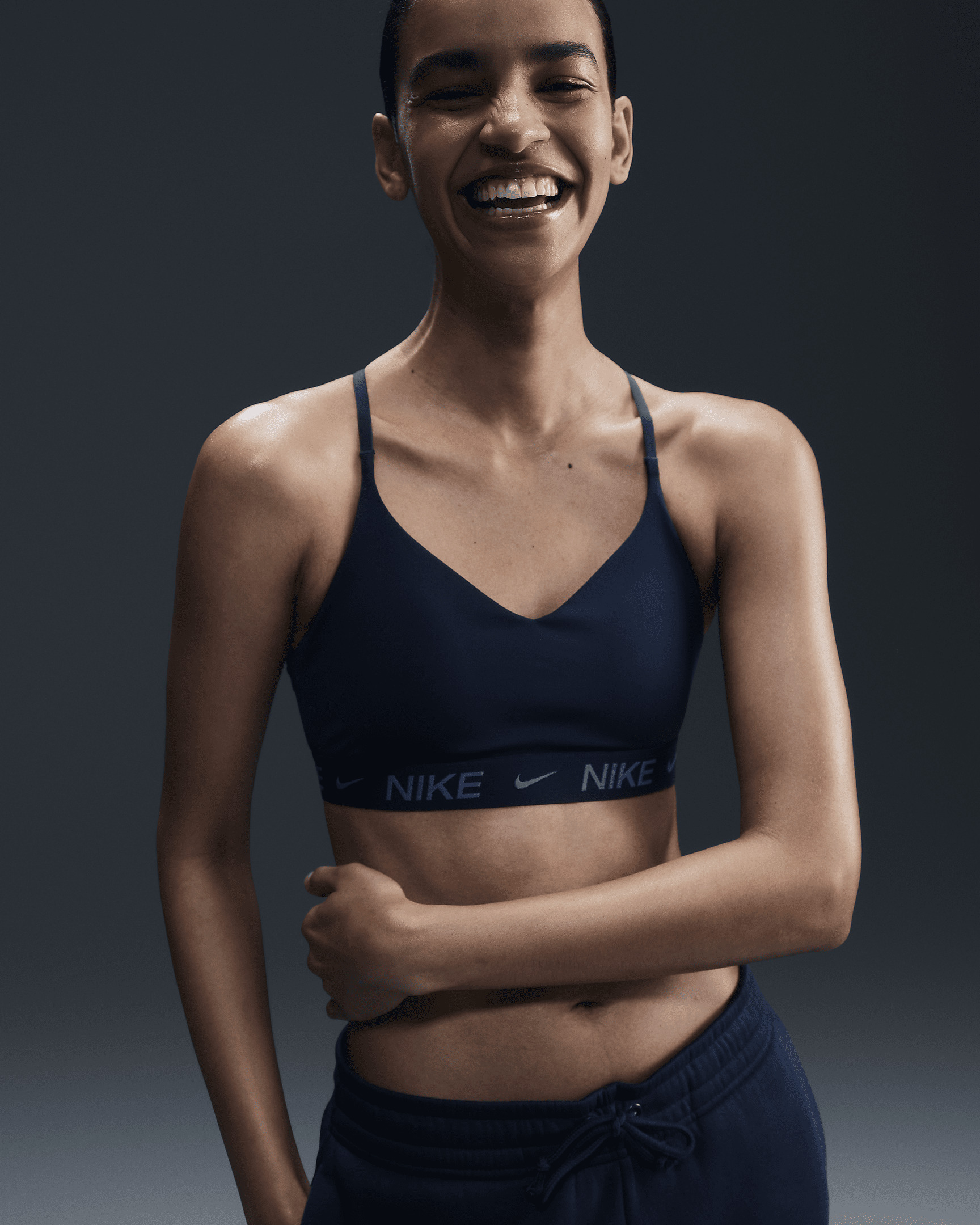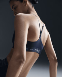 Don't let anything get in the way of expressing yourself in this sleek, low-profile sports bra. Its light support gives you a gentle hold with plenty of freedom that's great for low-impact workouts or all-day comfort. Smooth, quick-drying fabric gives the bra a clean finish so you can wear it your way. More Benefits - Nike Dri-FIT technology moves sweat away from your skin for quicker evaporation, helping you stay dry and comfortable. - Soft jacquard chest band sits snugly against your skin without pinching or binding. Product Details - Body: 78-79% polyester/21-22% spandex. Bottom hem: 53% polyester/28% nylon/19% spandex. Straps: 52% polyester/32% spandex/16% nylon. Lining: 84% polyester/16% spandex. Interlining: 80% polyester/20% spandex. Pad top fabric/Pad back fabric: 100% polyester. Pad: 100% polyurethane. - Machine wash - Imported - Shown: Armory Navy - Style: FD1062-478 SIZE & FIT Model is wearing size S Model height: 5′11″180cm Model bust: 30″76cm Tight fit: snug and form-fitting Light support: feels ke a soft hug with plenty of freedom