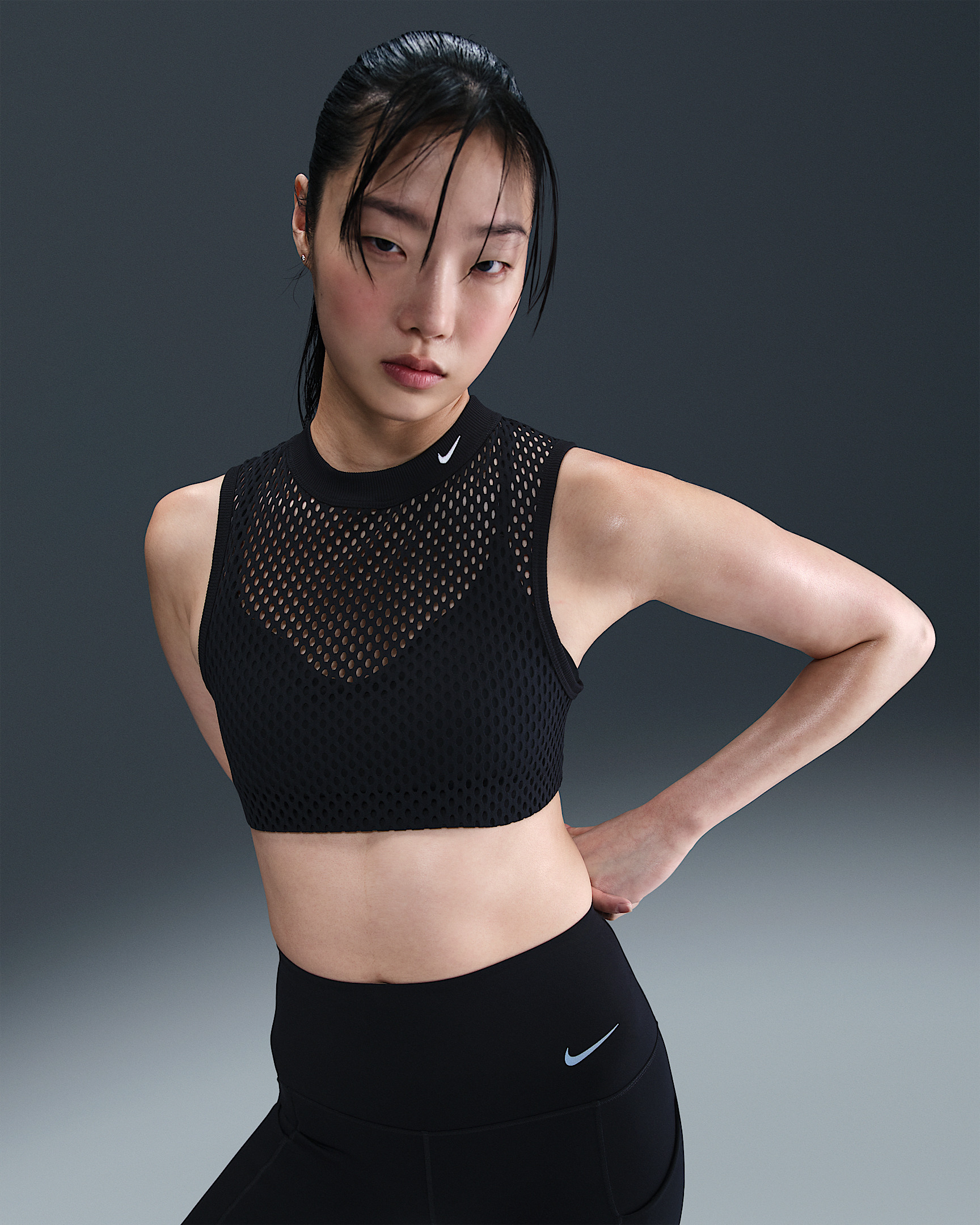 Why choose between fashion and function? With stretchy, net-inspired mesh on the outside and sleek, low-profile coverage inside, this bra gives you both. Light-support gives you a gentle hold with plenty of freedom. Product Details - Ribbed trim at neck and arm openings - Embroidered Swoosh logo on neck - Body: 69% polyester/31% spandex. Rib: 78% nylon/22% spandex. Bra: 78-79% polyester/21-22% spandex. Bra Lining: 84% polyester/16% spandex. Interlining: 80% polyester/20% spandex. Insets lining: 69% polyester/31% spandex. Pad top fabric/Pad back fabric: 100% polyester. Pad: 100% polyurethane. Elastic: 0-79% polyester/0-21% spandex. - Machine wash - Imported - Shown: Black/White - Style: HF5422-010 SIZE & FIT Model is wearing size S Model height: 5′9″175cm Model bust: 32″81cm Tight fit: snug and form-fitting Light support: feels ke a soft hug with plenty of freedom