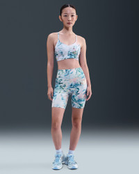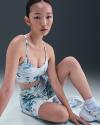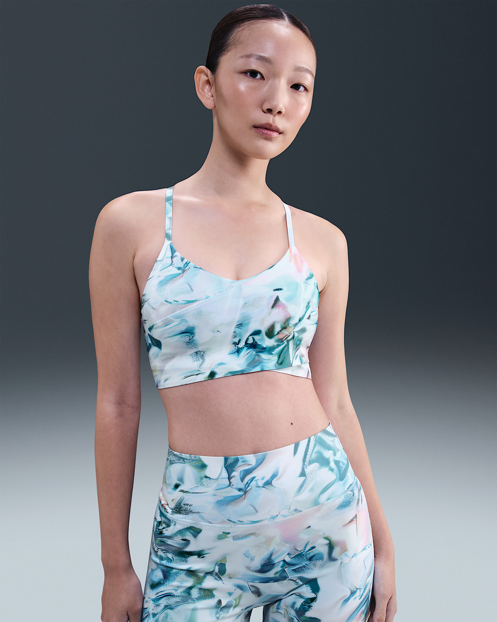 Susan Fang merges with Nike to bring you a wrap bra swirling with edge. The dynamic print combines with sweat-concealing tech to help keep you looking fresh. Midweight, ultrasmooth fabric and light support give you a gentle hold and distinct look. Product Details - Body: 77% polyester/23% spandex. Elastic: 79% polyester/21% spandex. Lining: 84% polyester/16% spandex. Interlining: 80% polyester/20% spandex. Pad top/back fabric: 100% polyester. Pad: 100% polyurethane. - Wrap design - Machine wash - Imported - Shown: Blue Tint - Style: HQ3954-423 SIZE & FIT Model is wearing size XS Model height: 5′7″170cm Model bust: 33″84cm Tight fit: snug and form-fitting Light support: feels ke a soft hug with plenty of freedom