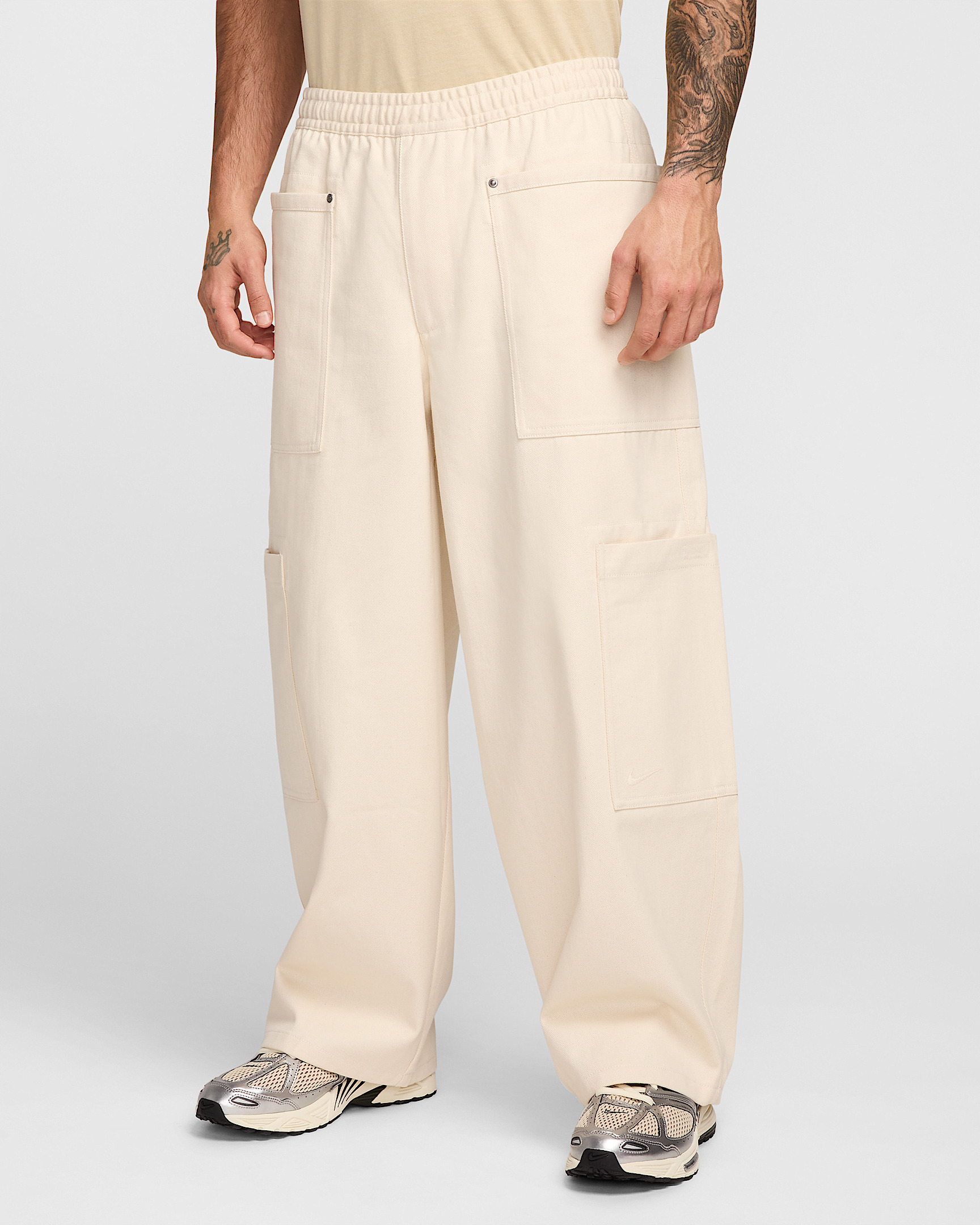 Built for life and made to last, these oversized utility pants deliver a strong workwear aesthetic. With heavyweight twill fabric, reinforced stitching, a roomy fit and lots of pockets, they’re an easy choice for taking on the day-to-day grind. More Benefits - Designed to feel roomy through the seat, thighs and legs for easy movement and casual styling. Product Details - Elastic waistband with drawcord - Zipper fly - 100% Cotton - Machine wash - Imported - Shown: Pure/Pure - Style: HJ0643-901 SIZE & FIT Model is wearing size M and is 6′1″185cm Loose fit: roomy and relaxed