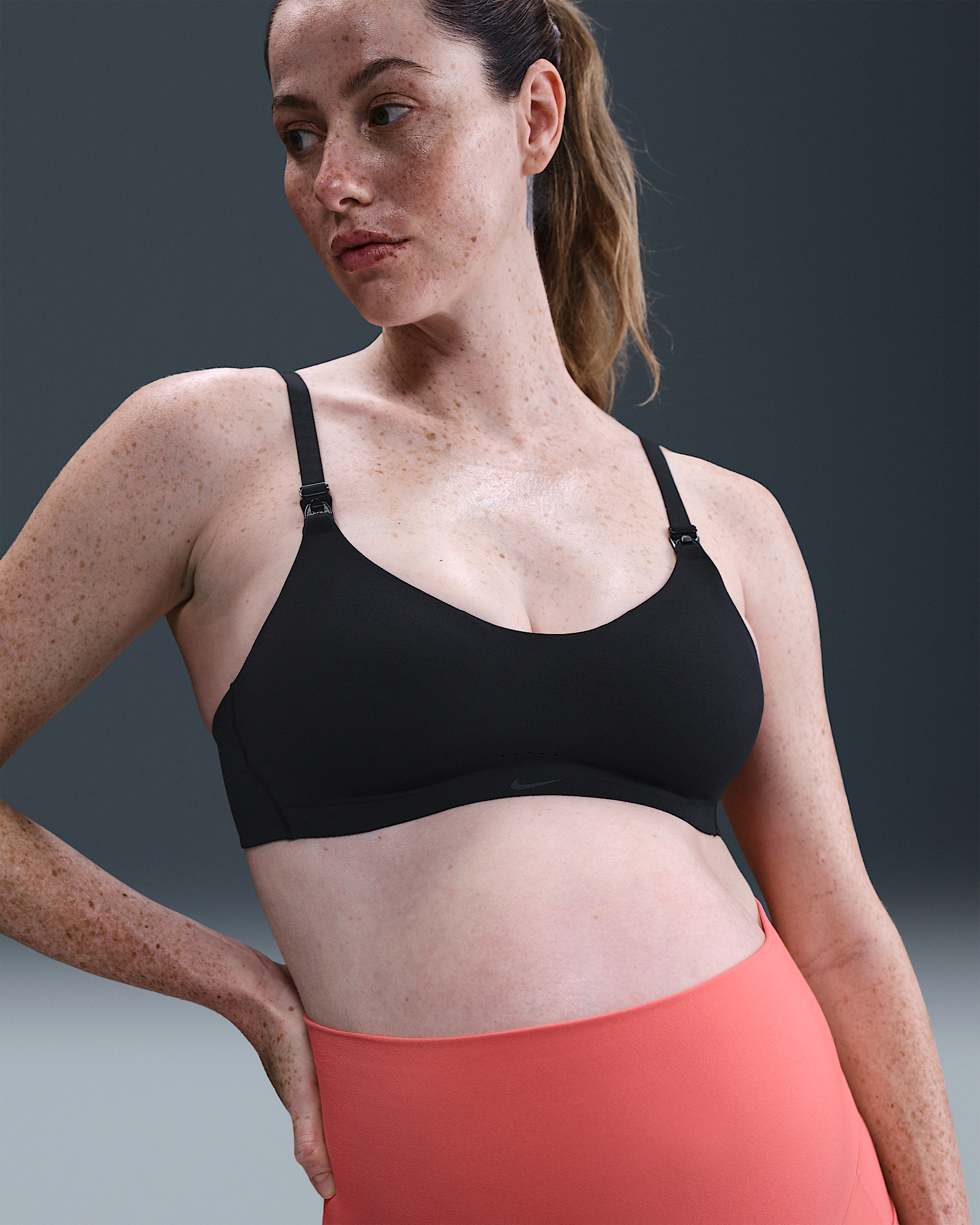 This bra offers gentle support in an adjustable design. Its soft, stretchy fabric contours to your changing shape for a barely there feel. The lightweight lining around the padded cups has leak protection technology, so you can take on your every day of your pregnancy journey without worry. More Benefits - Soft, adjustable straps and four rows of adjusters on the hook-and-eye closure can easily accommodate size fluctuations. - Nike Dri-FIT technology moves sweat away from your skin for quicker evaporation, helping you stay dry and comfortable. Product Details - Wireless construction - Body/Panels lining: 74% polyester/26% spandex. Insets lining: 86% polyester/14% spandex. Pad back fabric: 100% polyester. Pad: 100% Polyurethane. - Machine wash - Imported - Shown: Black/Cool Grey Heather - Style: FQ7385-010 SIZE & FIT Model is wearing size SA-C Model height: 5′10″178cm Model bust: 32″81cm Tight fit: snug and form-fitting Light support: feels ke a soft hug with plenty of freedom