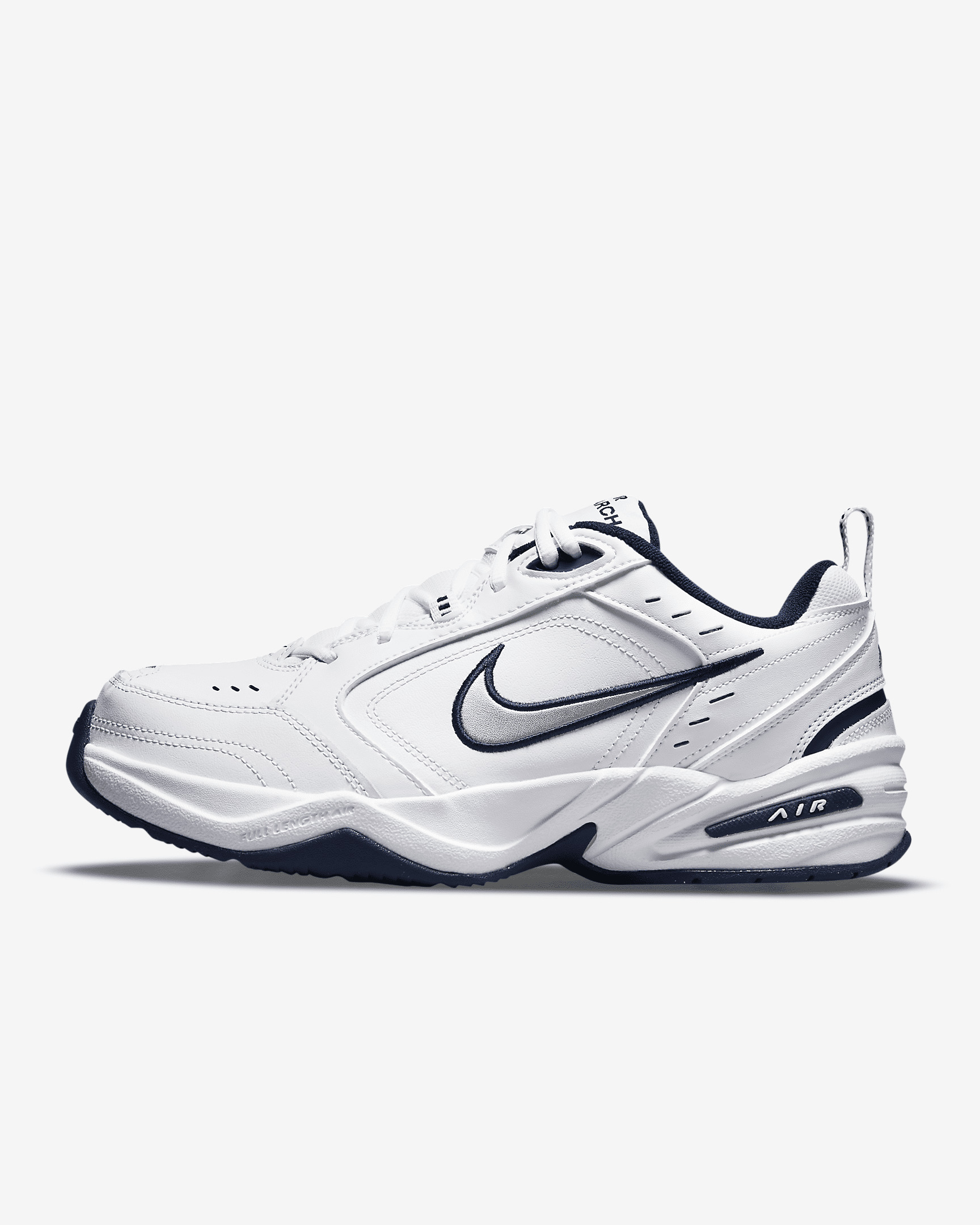 The Nike Air Monarch IV gives you classic style with real leather and plenty of lightweight Nike Air cushioning to keep you moving in comfort. Benefits - Leather and synthetic leather team up for durability and classic comfort. - An Air-Sole unit runs the length of your foot for cushioning, comfort and support. - Rubber sole is durable and provides traction. - Shown: White/Midnight Navy/White/Metallic Silver - Style: 416355-102