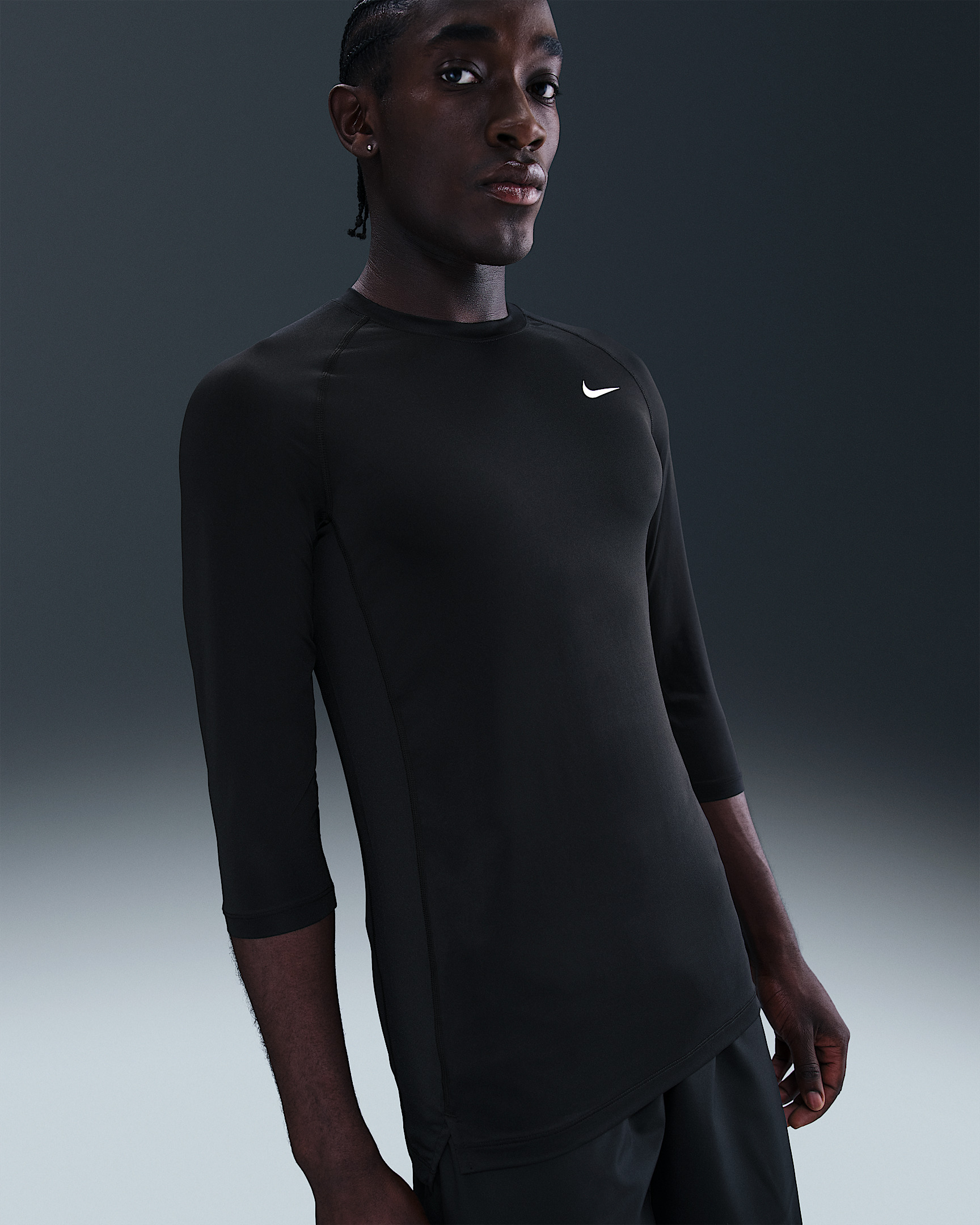 Take the field with confidence in the 3/4-sleeve Nike Top, perfect for wearing on its own or under your game-day uniform. It combines sweat-wicking fabric with mesh insets to help keep you dry and cool, whether you’re running drills or running the bases. Choose from various colors to outfit your team. Benefits - Nike Dri-FIT technology moves sweat away from your skin for quicker evaporation, helping you stay dry and comfortable. - Breathable mesh panels at the upper back, underarms and sides help keep you cool. - Lightweight knit fabric stretches with your body to let you move freely. Product Details - Stretch jersey knit fabric - 3/4-length sleeves - Mesh panels underarm and upper back - 92% polyester/8% spandex - Machine wash - Imported - Shown: Black/White - Style: FZ1364-010 SIZE & FIT Model is wearing size M and is 6′0″183cm Standard fit: easy and traditional