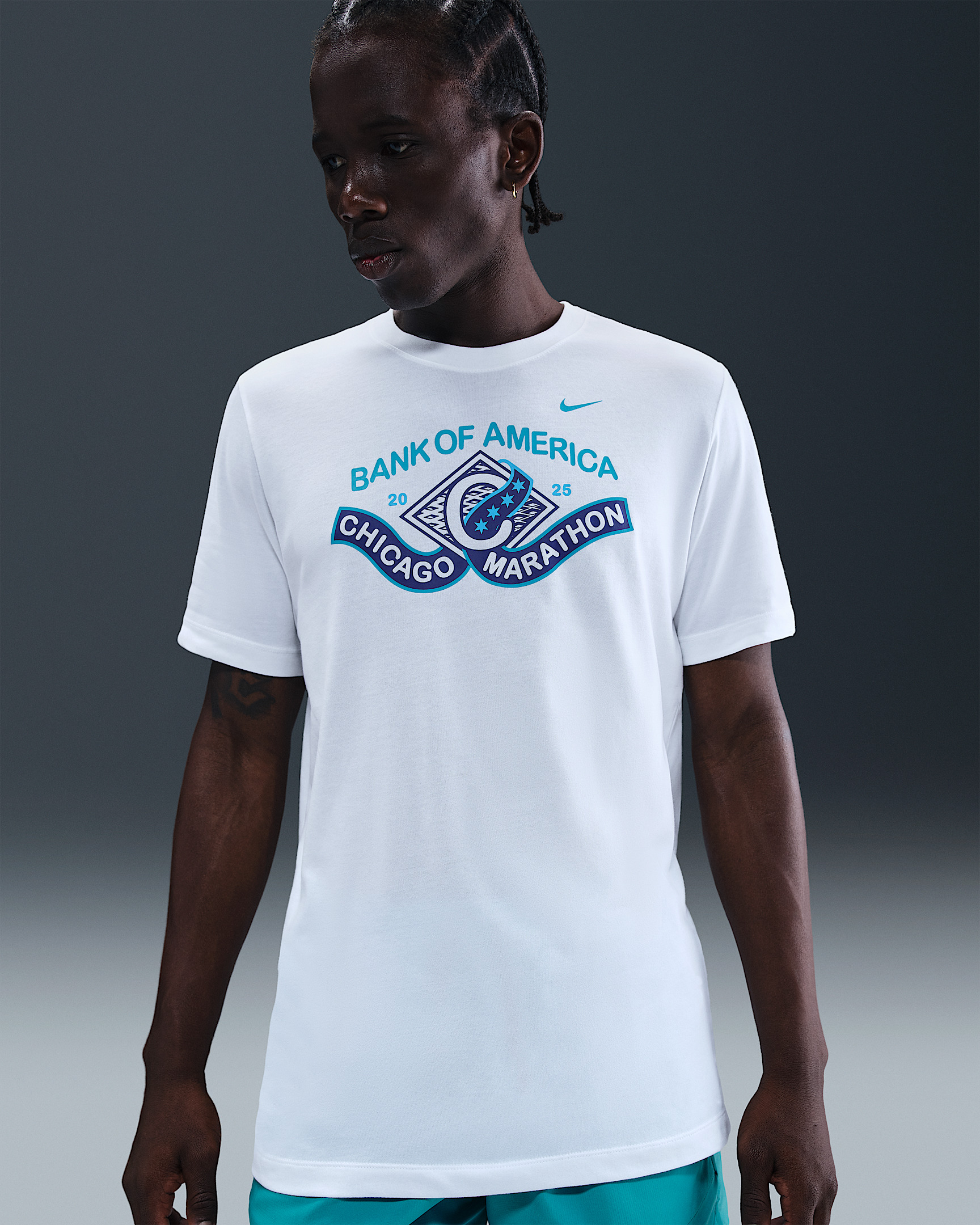 This Bank of America Chicago Marathon tee is ready for race day. Lightweight and breathable peached fabric has sweat-wicking technology to help keep you dry and comfortable. Product Details - 57% cotton/43% polyester - Machine wash - Imported - Shown: White/Light Current Blue - Style: HQ4169-100 SIZE & FIT Model is wearing size M and is 6′1″185cm Standard fit: easy and traditional