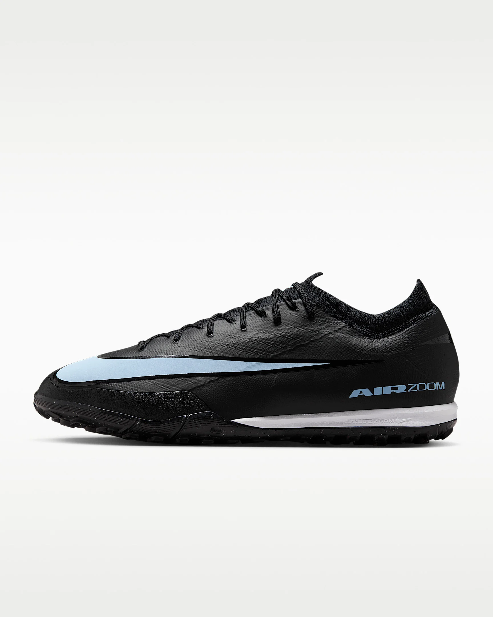 Serious about your speed? Pro cleats are for those who want to push the pace all match long. That's why we made these with an improved Air Zoom unit. It gives you and those devoted to the game the propulsive feel needed to break through the back line. Take your skills to the next level with some of Nike’s greatest innovations like Flyknit on the upper, which makes the shoe even lighter so you can play fast. Product Details - For use on shorter, synthetic surfaces - Cushioned insole - Shown: Black/Ice Blue - Style: FQ8687-001 SIZE & FIT Contoured: designed for a contoured fit, enabng a barefoot boot-to-ball sensation and enhanced lockdown Snug fit; if you prefer a sghtly looser fit, we recommend ordering a half-size up
