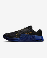 Whatever your "why" is for working out, the Metcon 9 makes it all worth it. We improved on the 8 with a larger Hyperlift plate and added rubber rope wrap. Sworn by some of the greatest athletes in the world, intended for lifters, cross trainers, go-getters, it’s still the gold standard that delivers day after day. More Benefits - Full rubber outsole provides durable traction for dynamic movements like cleans and walking lunges. - Breathable textile has a haptic print, which creates a 3-D effect that adds durability and texture, helping make it easier to keep your shoes clean. Also, it sports flexible, durable support in the toe area, so that when your toes splay when lifting heavy weights, it won’t feel restrictive. Product Details - Shown: Black/Deep Night/Copper Moon/Blue Void - Style: HF1098-001