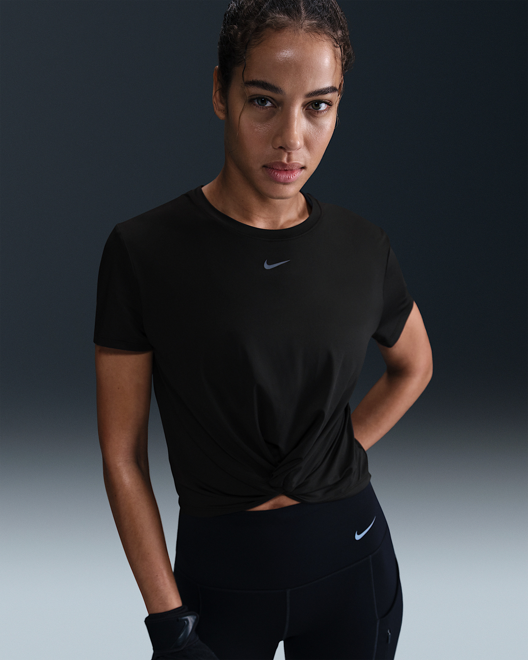 Nike One works for it all. This top is made with lightweight, silky-smooth fabric that dries quickly, helping you stay ready for wherever your day takes you. Product Details - 89% polyester/11% spandex - Reflective Swoosh logo at center chest - Not intended for use as Personal Protective Equipment (PPE) - Machine wash - Imported - Shown: Black/Black - Style: HJ1054-010 SIZE & FIT Model is wearing size S and is 5′9″175cm Sm fit: sleek and tailored