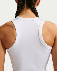 Up for a workout or down to chill, this Nike One Fitted tank top is ready for whatever you are. Midweight, peachy-soft fabric stretches with your every move and dries quickly. Slightly cropped and snug, it's ready to meet your favorite high-waisted leggings for a head-to-toe look that you can feel confident and comfortable in from your morning stroll to your evening wind-down—and at all the stops in between. More Benefits - Nike Dri-FIT technology moves sweat away from your skin for quicker evaporation, helping you stay dry and comfortable. - High neckline with racerback is designed to cover traditional sports bras. Product Details - 80% polyester/20% spandex - Machine wash - Imported - Reflective heat transfer Swoosh logo at center back - Not intended for use as Personal Protective Equipment (PPE) - Shown: White/Black - Style: FN2806-101 SIZE & FIT Model is wearing size M and is 5'6"168cm Tight fit: snug and form-fitting