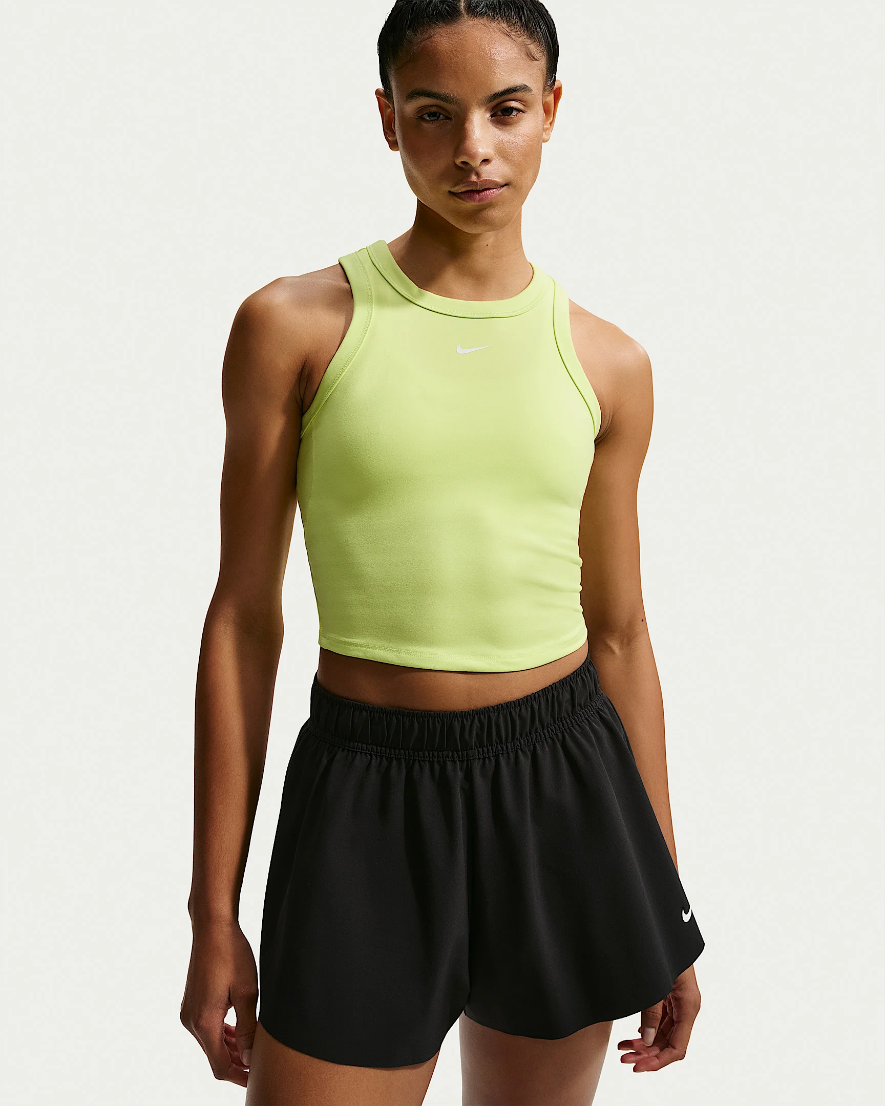 Up for a workout or down to chill, this Nike One Fitted tank top is ready for whatever you are. Midweight, peachy-soft fabric stretches with your every move and dries quickly. Slightly cropped and snug, it's ready to meet your favorite high-waisted leggings for a head-to-toe look that you can feel confident and comfortable in from your morning stroll to your evening wind-down—and at all the stops in between. More Benefits - Nike Dri-FIT technology moves sweat away from your skin for quicker evaporation, helping you stay dry and comfortable. - High neckline with racerback is designed to cover traditional sports bras. Product Details - 80% polyester/20% spandex - Machine wash - Imported - Reflective heat transfer Swoosh logo at center back - Not intended for use as Personal Protective Equipment (PPE) - Shown: Light Lemon Twist/White - Style: FN2806-736 SIZE & FIT Model is wearing size S and is 5′10″178cm Tight fit: snug and form-fitting
