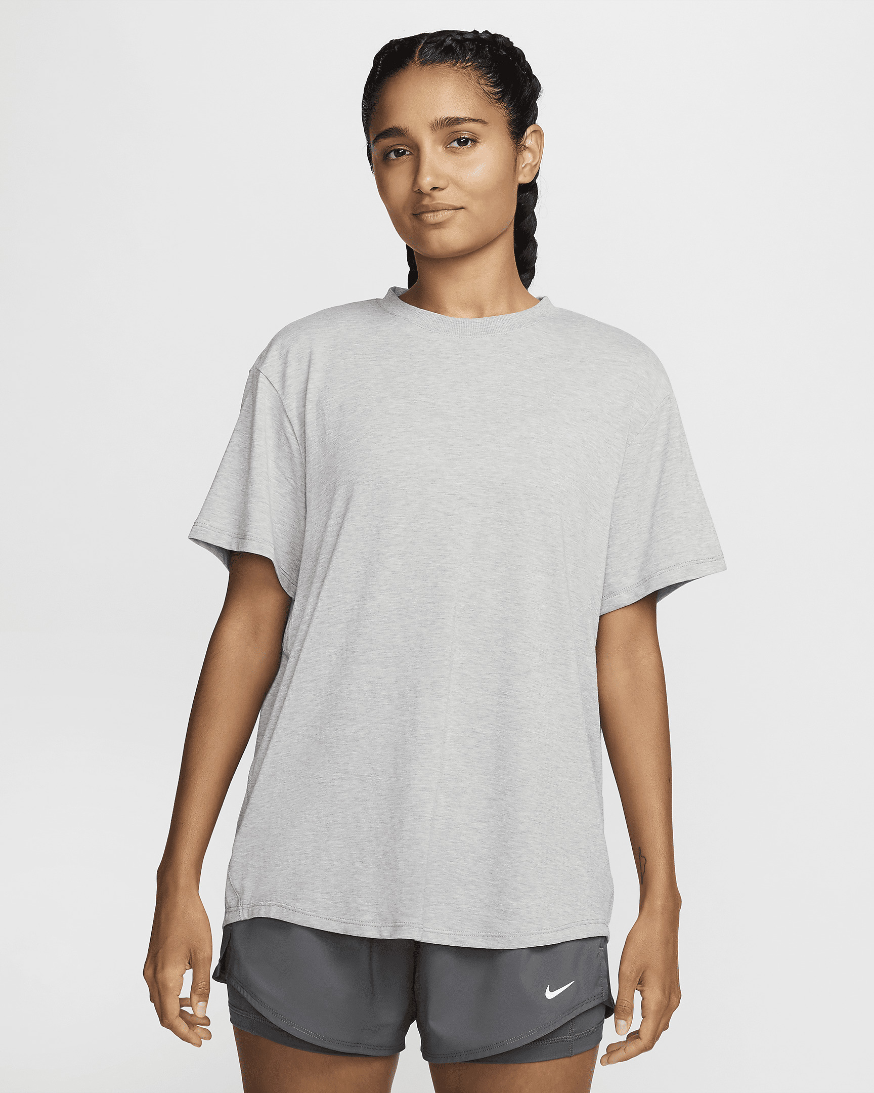Up for a workout or down to chill, this Nike One Relaxed top is ready for whatever you are. Slightly textured, incredibly lightweight jersey fabric dries quickly and drapes you in comfort that goes with any activity. A loose, roomy fit and extended length help keep you covered and cozy from your morning stroll to your evening wind-down—and at all the stops in between. More Benefits - Nike Dri-FIT technology moves sweat away from your skin for quicker evaporation, helping you stay dry and comfortable. - Curved hem helps keep you covered as you move. Product Details - 81% polyester/13% cotton/6% spandex - Machine wash - Imported - Reflective logo at center back - Not intended for use as Personal Protective Equipment (PPE) - Shown: Smoke Grey/Heather/Black - Style: FN2814-084 SIZE & FIT Model is wearing size S and is 5′9″175cm Loose fit: roomy and relaxed