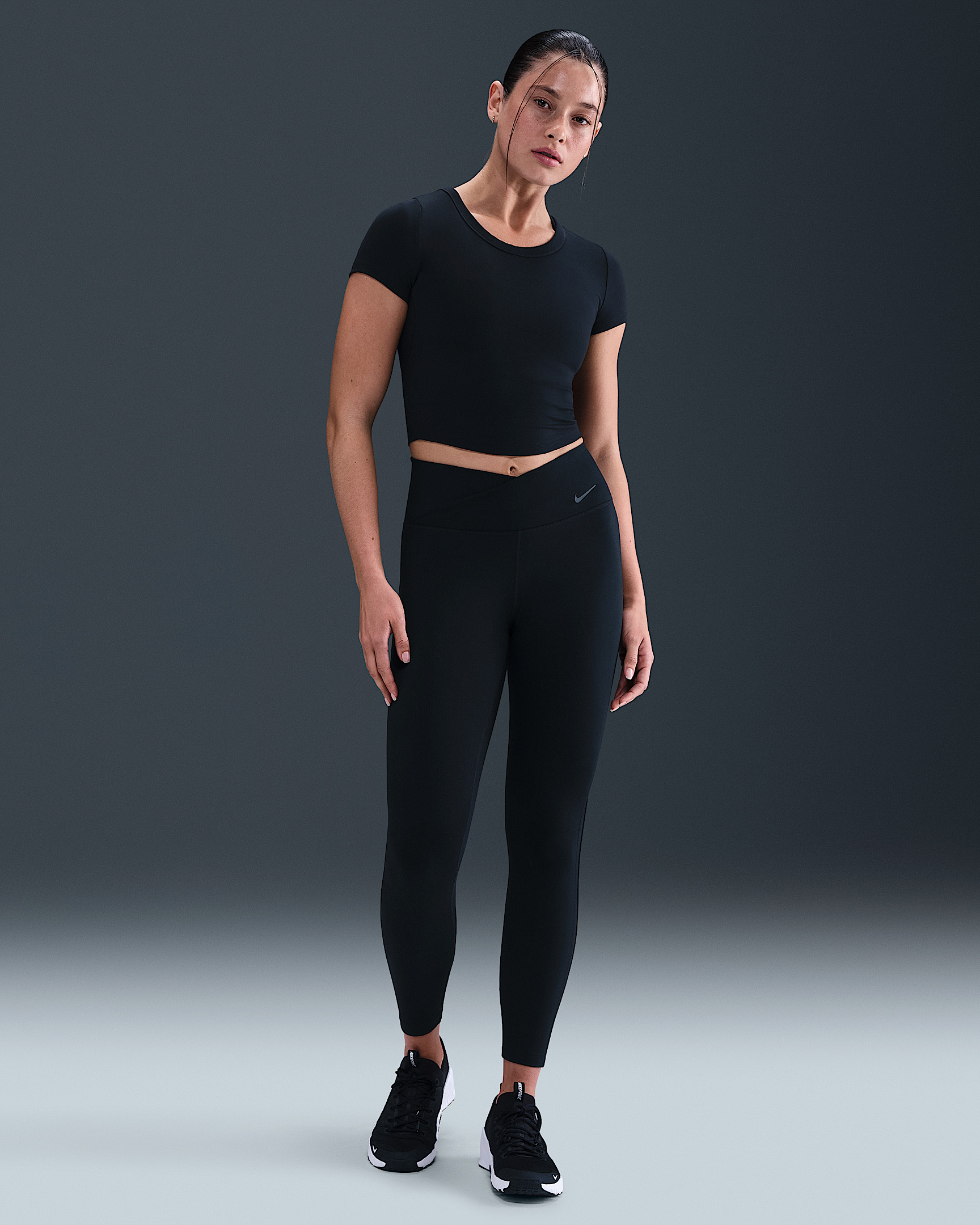 Nike One works for it all. Elevated with sheer panels down the legs and a crossover waistband, these midweight, peachy-soft leggings stretch with your every move and dry quickly. Benefits - Nike Dri-FIT technology moves sweat away from your skin for quicker evaporation, helping you stay dry and comfortable. - Back pocket fits most phones. Product Details - Printed Swoosh logo on waistband - Body: 80% polyester/20% spandex. Panels: 72% polyester/28% spandex. Gusset lining: 100% polyester. - Machine wash - Imported - Shown: Black/Dark Smoke Grey - Style: HV2292-010 SIZE & FIT Model is wearing size S and is 5′9″175cm Tight fit: snug and form-fitting Gentle support: feels ke a soft hug with plenty of freedom 78 length: hits at ankle High-Waisted: sits at or above your natural waist for more coverage