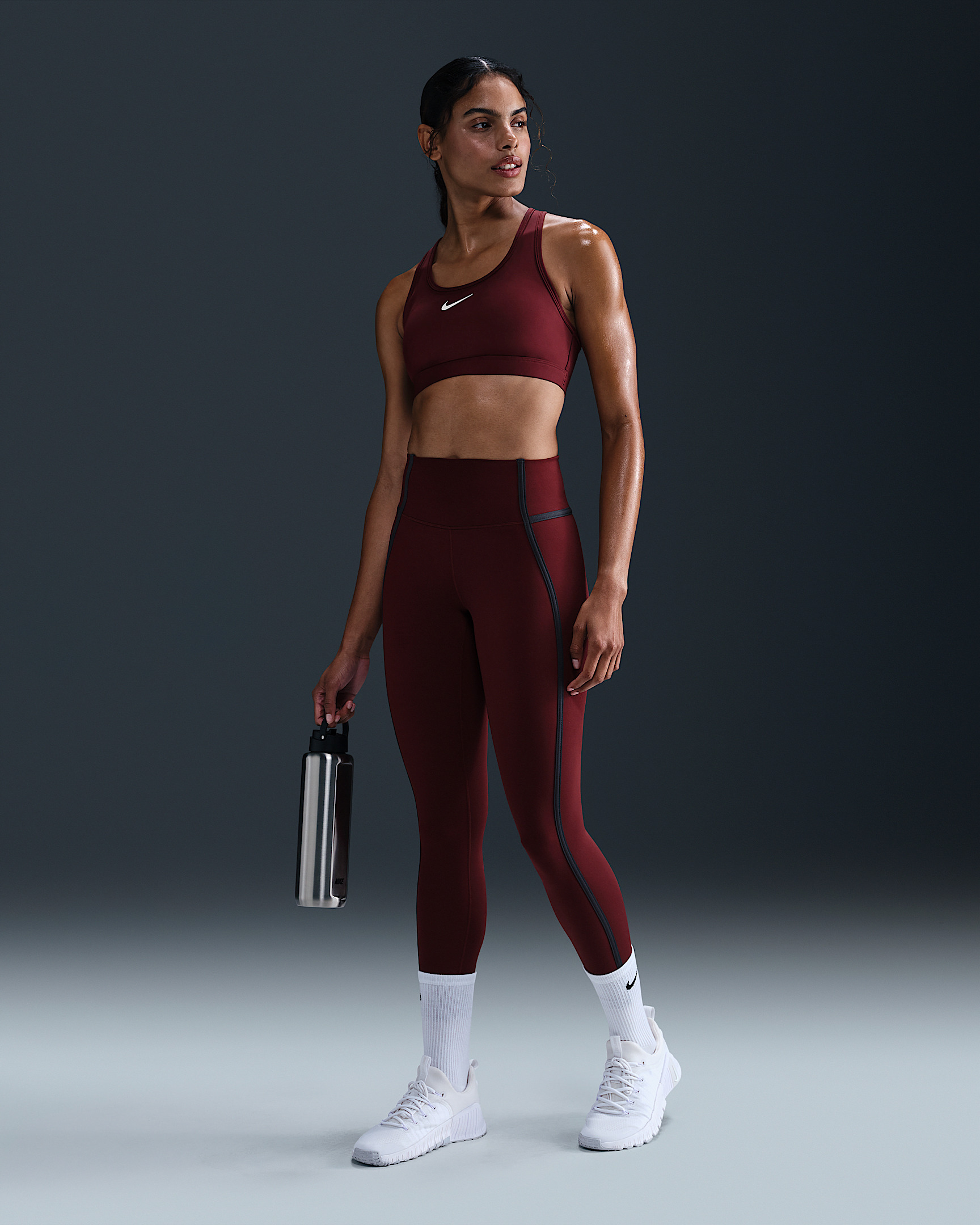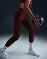 Nike One works for it all. These nonsheer leggings help keep you covered with midweight, peachy-soft fabric that stretches with your every move. Benefits - Nike Dri-FIT technology moves sweat away from your skin for quicker evaporation, helping you stay dry and comfortable. - Back pocket fits most phones. - Taping adds definition and contrast. Product Details - Reflective Swoosh logo at center back - Not intended for use as Personal Protective Equipment (PPE) - Body/Waist lining: 80% polyester/20% spandex. Gusset lining: 100% polyester. - Machine wash - Imported - Shown: Dark Team Red/Armory Navy/Black - Style: HJ1137-619 SIZE & FIT Model is wearing size S and is 5′10″178cm Tight fit: snug and form-fitting Gentle support: feels ke a soft hug with plenty of freedom 78 length: hits at ankle High-Waisted: sits at or above your natural waist for more coverage