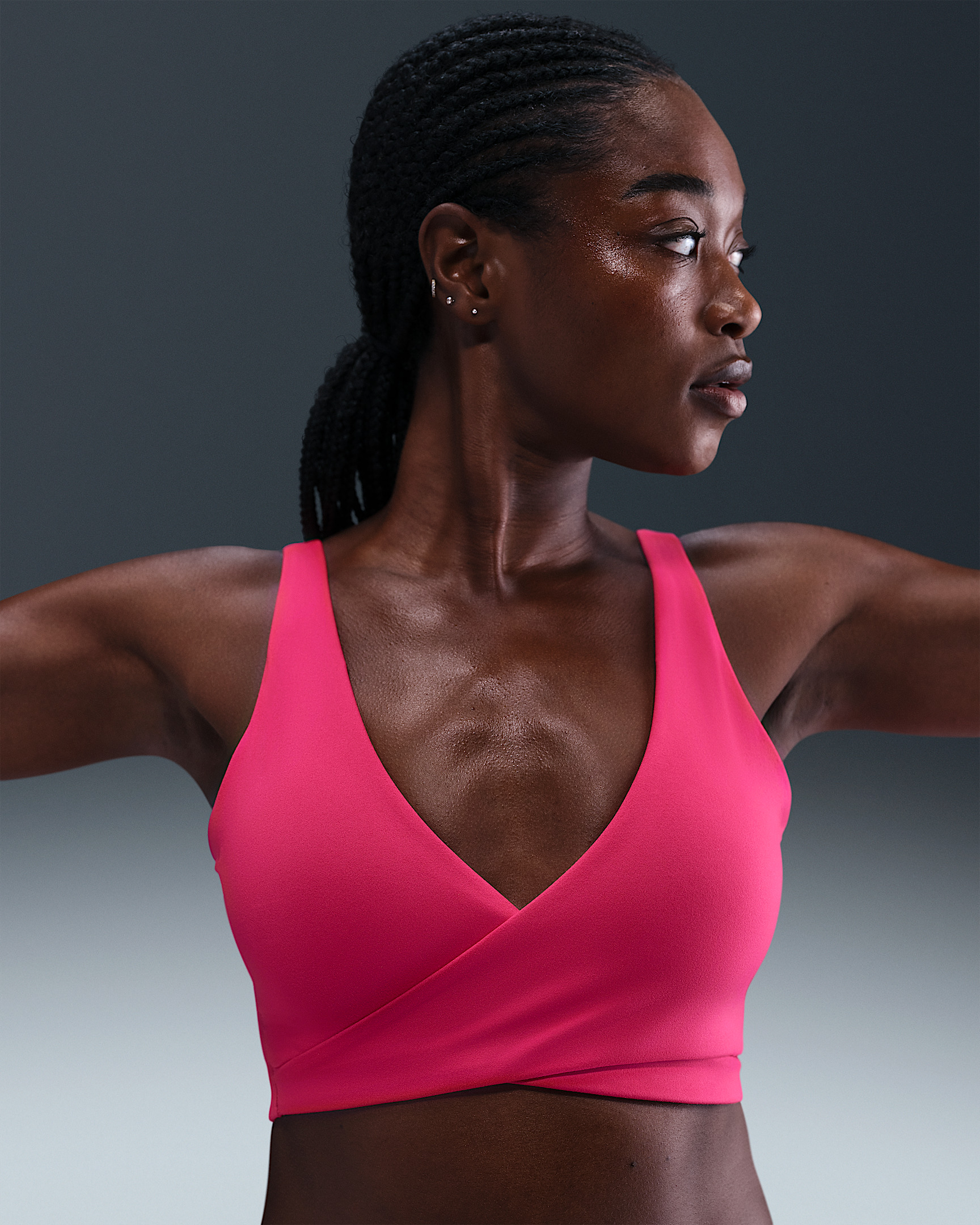 Move easy in this wrap style bra. Its light support provides a gentle hold with plenty of freedom. A sleek breathable liner combines with midweight, peachy-soft fabric that dries quickly and stretches with you. Benefits - Nike Dri-FIT technology moves sweat away from your skin for quicker evaporation, helping you stay dry and comfortable. - Removable pads let you choose your coverage. Product Details - Body/Interlining: 80% polyester/20% spandex. Lining: 88% polyester/12% spandex. Pad top fabric/Pad back fabric: 100% polyester. Pad: 100% polyurethane. - Machine wash - Imported - Shown: Rush Pink/Sweet Beet - Style: HQ2813-666 SIZE & FIT Model is wearing size S Model height: 5′8″173cm Model bust: 31″79cm Tight fit: snug and form-fitting Light support: feels ke a soft hug with plenty of freedom