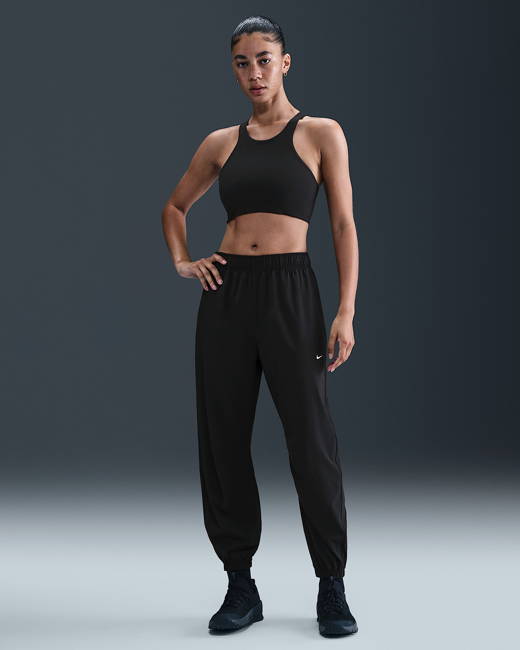 Nike One works for it all. Lightweight and water-repellent, these roomy woven pants stretch with you through every move. Benefits - Water-repellent finish helps keep you dry in wet weather. - Side pockets are lined with sweat-wicking mesh to help keep your essentials dry Product Details - Encased elastic waistband with drawcord - Elastic cuffs - Printed Swoosh logo on left thigh - Body: 85% polyester/15% spandex. Mesh: 100% polyester. - Machine wash - Imported - Shown: Black/White - Style: IH8611-010 SIZE & FIT Model is wearing size S and is 5'9"175cm Loose fit: roomy and relaxed Fl length: hits below ankle