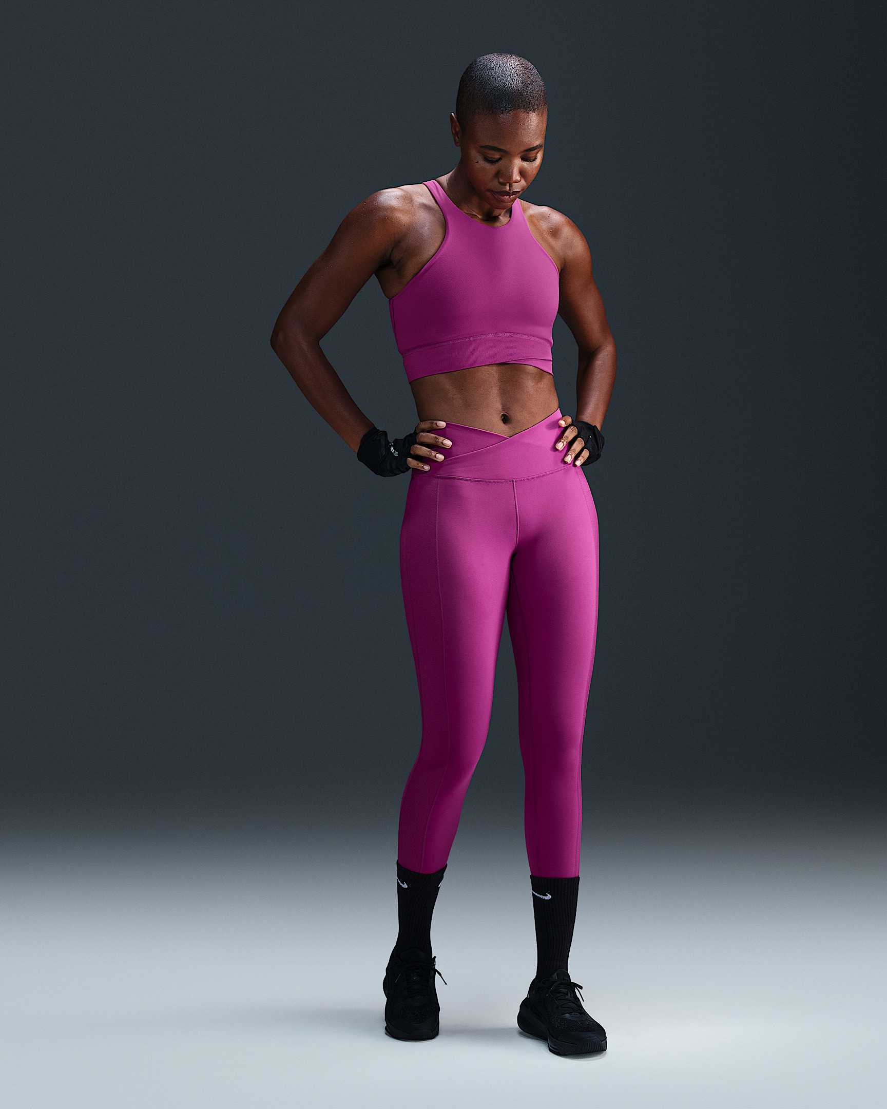 Up for a workout or down to chill, these leggings are the Ones that are ready for whatever you are. Their midweight, peachy-soft fabric stretches with your every move and dries quickly. A wrapped waistband that crosses in the front works with ribbed side panels to add extra dimension to your look. More Benefits - Nike Dri-FIT technology moves sweat away from your skin for quicker evaporation, helping you stay dry and comfortable. - Back pocket fits most phones. Product Details - Body/Waist lining: 80% polyester/20% spandex. Gusset lining: 100% polyester. - Machine wash - Imported - Reflective elements - Not intended for use as Personal Protective Equipment (PPE) - Shown: Hot Fuchsia/White - Style: FV7857-518 SIZE & FIT Model is wearing size S and is 5′11″180cm Tight fit: snug and form-fitting Gentle support: feels ke a soft hug with plenty of freedom 78 length: hits at ankle High-Waisted: sits at or above your natural waist for more coverage