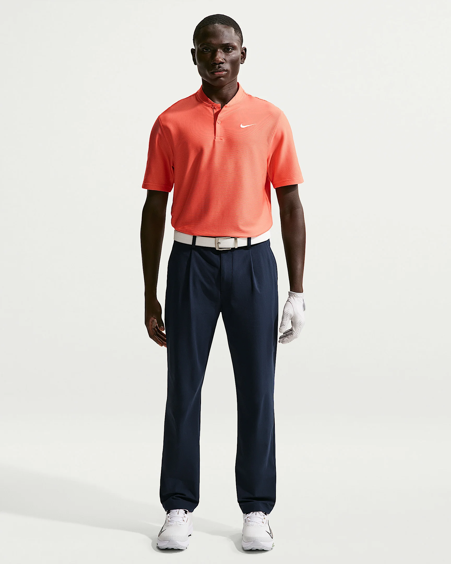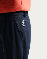 Ready for today's game, these slim-fit pants use a stretchy, sweat-wicking fabric to help keep you comfortable throughout your round. Golf-ready details keep all the small stuff organized while classic lines and a subtle drape give them a clean look ready for everyday wear. Benefits - Nike Dri-FIT technology moves sweat away from your skin for quicker evaporation, helping you stay dry and comfortable. - Woven lined pockets add a premium feel and help stop tees and ball markers from snagging. - Built-in storage keeps your tees handy, so even if you lose your swing, you can always find a tee. - Premium piping finishes and a Nike Shield logo on the back right pocket provide a premium look. - The stretch waistband is lined with gripper tape for a snug fit that helps tucked shirts stay put. Product Details - Slim fit - 4-way stretch knit fabric - Back pockets - Belt loops - Body: 100% polyester. Pockets: 86% polyester/14% spandex. - Machine wash - Imported - Shown: College Navy/Black/College Navy - Style: IB0643-419 SIZE & FIT Sm fit: sleek and tailored