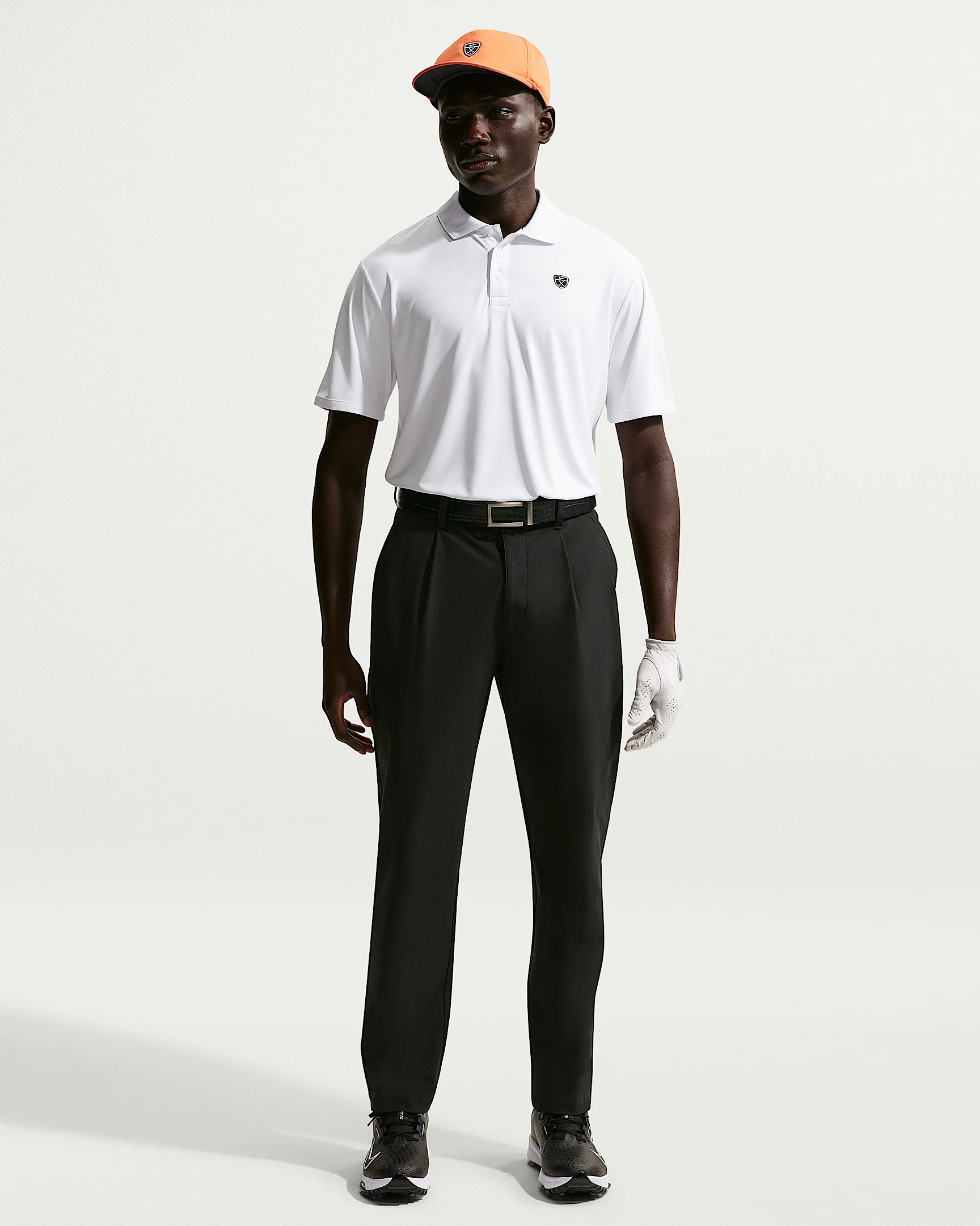 Ready for today's game, these slim-fit pants use a stretchy, sweat-wicking fabric to help keep you comfortable throughout your round. Golf-ready details keep all the small stuff organized while classic lines and a subtle drape give them a clean look ready for everyday wear. Benefits - Nike Dri-FIT technology moves sweat away from your skin for quicker evaporation, helping you stay dry and comfortable. - Woven lined pockets add a premium feel and help stop tees and ball markers from snagging. - Built-in storage keeps your tees handy, so even if you lose your swing, you can always find a tee. - Premium piping finishes and a Nike Shield logo on the back right pocket provide a premium look. - The stretch waistband is lined with gripper tape for a snug fit that helps tucked shirts stay put. Product Details - Slim fit - 4-way stretch knit fabric - Back pockets - Belt loops - Body: 100% polyester. Pockets: 86% polyester/14% spandex. - Machine wash - Imported - Shown: Black/Black/Black - Style: IB0643-010 SIZE & FIT Sm fit: sleek and tailored
