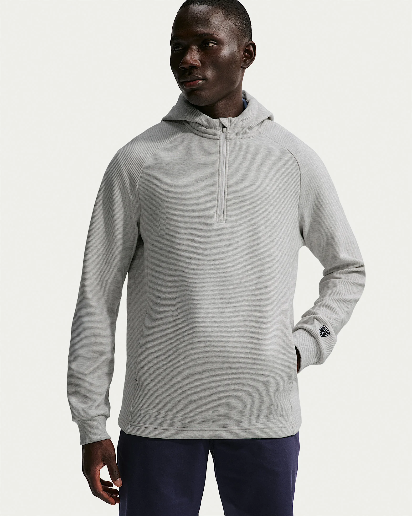 Get after early starts and lower temps with this lightweight fleece hoodie. A subtle ribbed texture and Therma-FIT tech give it a clean look and versatile warmth that won't weigh you down or get in the way. Benefits - Nike Therma-FIT technology helps manage your body’s natural heat to help keep you warm in cold-weather conditions. - Piping detail on the shoulder seam provides a clean look that ties back to the rest of the Par Collection. - Stretchy, ribbed cuffs provide a snug, locked in feel while a zipper guard at the collar provides a clean, distraction-free fit. Product Details - Heathered spacer knit material with stretch - This product provides UVA and UVB protection from the sun only in the areas covered by the garment. To protect exposed areas, the use of good quality sunscreen is recommended. - Front pouch pocket - 1/2-zip design - Ribbed cuffs - Embroidered Nike Golf shield logo - Body: 77% polyester/21% cotton/2% spandex. Pockets: 100% polyester. Hood lining: 100% polyester. - Machine wash - Imported - Shown: Wolf Grey/White/Photon Dust/Black - Style: IB0294-012 SIZE & FIT Model is wearing size M and is 6′1″184cm Standard fit: easy and traditional