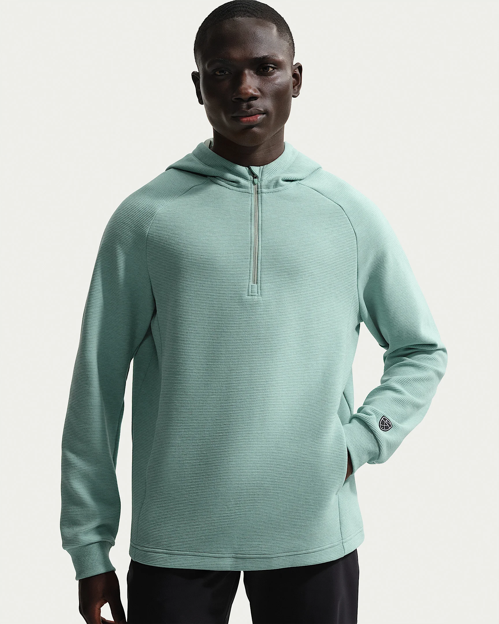 Get after early starts and lower temps with this lightweight fleece hoodie. A subtle ribbed texture and Therma-FIT tech give it a clean look and versatile warmth that won't weigh you down or get in the way. Benefits - Nike Therma-FIT technology helps manage your body’s natural heat to help keep you warm in cold-weather conditions. - Piping detail on the shoulder seam provides a clean look that ties back to the rest of the Par Collection. - Stretchy, ribbed cuffs provide a snug, locked in feel while a zipper guard at the collar provides a clean, distraction-free fit. Product Details - Heathered spacer knit material with stretch - This product provides UVA and UVB protection from the sun only in the areas covered by the garment. To protect exposed areas, the use of good quality sunscreen is recommended. - Front pouch pocket - 1/2-zip design - Ribbed cuffs - Embroidered Nike Golf shield logo - Body: 77% polyester/21% cotton/2% spandex. Pockets: 100% polyester. Hood lining: 100% polyester. - Machine wash - Imported - Shown: Steam/White/Steam/Black - Style: IB0294-006 SIZE & FIT Model is wearing size M and is 6′1″184cm Standard fit: easy and traditional