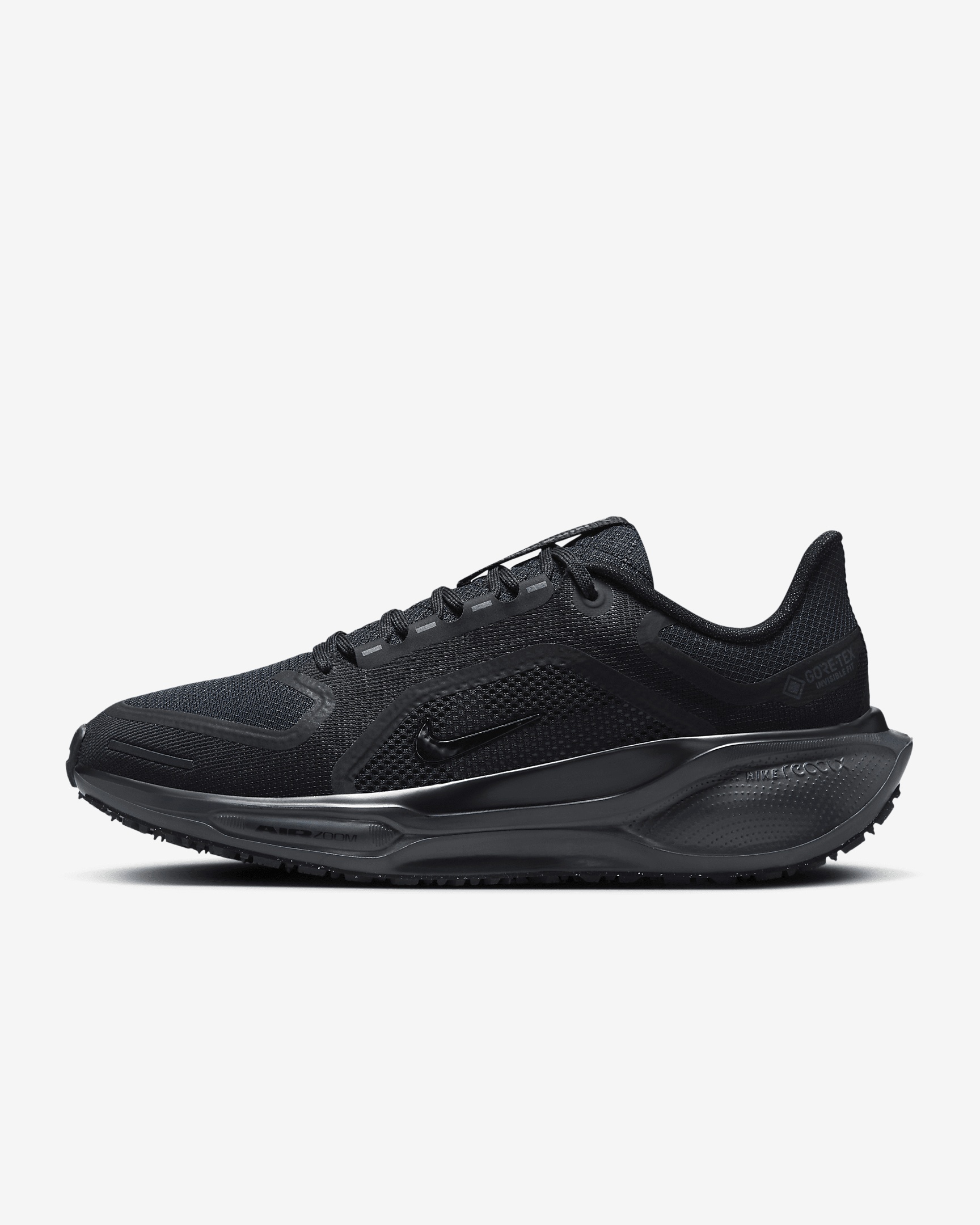 Responsive cushioning in the winterized Pegasus provides an energized ride for wet-weather road running. Experience lighter-weight energy return with dual Air Zoom units and a ReactX foam midsole. Plus, a waterproof GORE-TEX upper and reflective details throughout help you comfortably take on the elements. Benefits - Waterproof GORE-TEX upper and technical mesh help keep water out so your feet dry. - ReactX foam midsole surrounds forefoot and heel Air Zoom units for an energized ride. - Storm-Tread outsole provides traction in wet weather. - Heathered material around the collar helps keep your ankle warm. - What's new? All-new ReactX foam midsole is 13% more responsive than previous React technology. - Crafted for performance and planet, ReactX foam is engineered to reduce its carbon footprint by at least 43% in a pair of midsoles due to reduced manufacturing process energy compared to prior React foam. The carbon footprint of ReactX is based on cradle-to-gate assessment reviewed by PRe Sustainability B.V and Intertek China. Other midsole components such as airbags, plates or other foam formulations were not considered. Product Details - Reflective GORE-TEX logo and Swoosh logo - Reflective graphics and overlays - Not intended for use as Personal Protective Equipment (PPE) - Weight: Approx. 251 g/8.8 oz (Women's US 8) - Heel-to-toe drop: 10 mm - MR-10 Last - Our best, most consistent fit (same as Pegasus 40) - Plush collar, tongue and sockliner - Shown: Black/Anthracite/Black - Style: FQ1357-001
