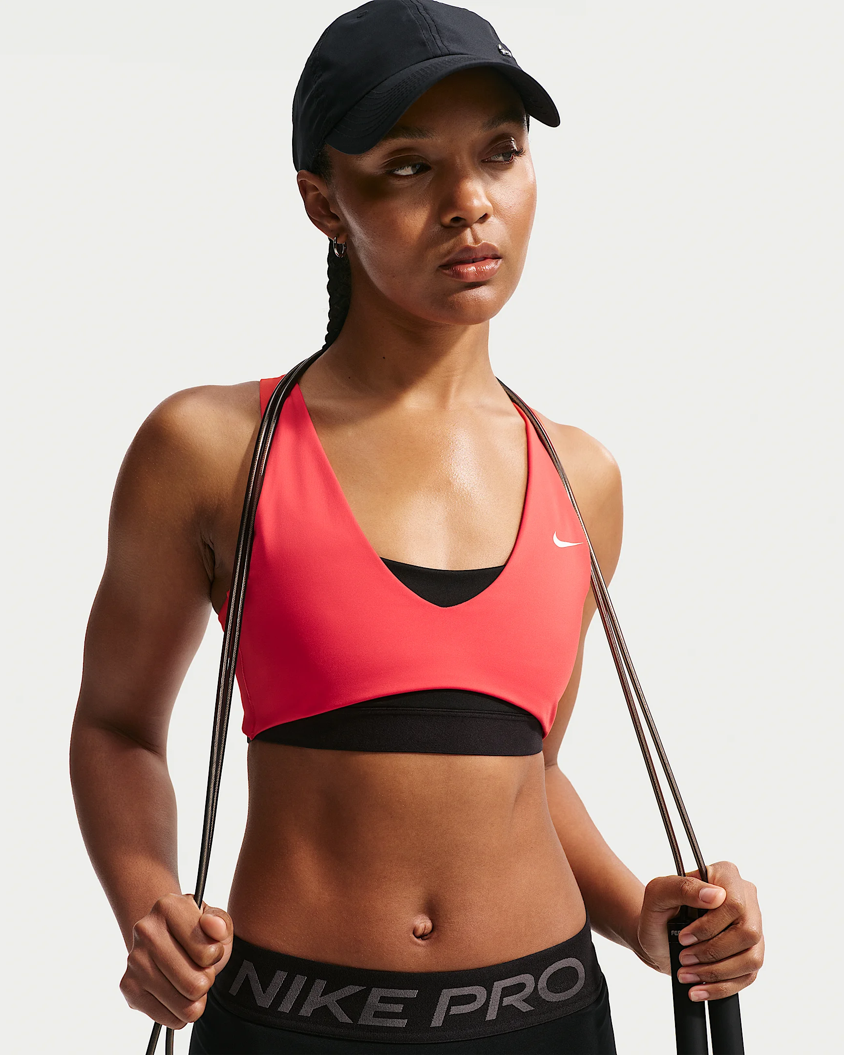 Go hard, stay cool. Thicker and stretchier than our classic Nike Pro material, this sweat-wicking bra pairs medium support with lightweight lining so you have reliable coverage. Benefits - Nike Dri-FIT technology moves sweat away from your skin for quicker evaporation, helping you stay dry and comfortable. - Medium support gives you a snug hold that helps keep everything in place. - Lightweight, breathable lining offers subtle coverage. Product Details - Body: 75% polyester/25% spandex; Underlay: 78% nylon/22% Spandex; Panels Lining: 88% polyester/12% spandex - Machine wash - Imported - Shown: Light Crimson/Black/White - Style: IR1891-696 SIZE & FIT Model is wearing size S Model height: 5′7″170cm Model bust: 30″75cm Tight fit: snug and form-fitting Medium support: feels ke a snug hold to keep everything in place