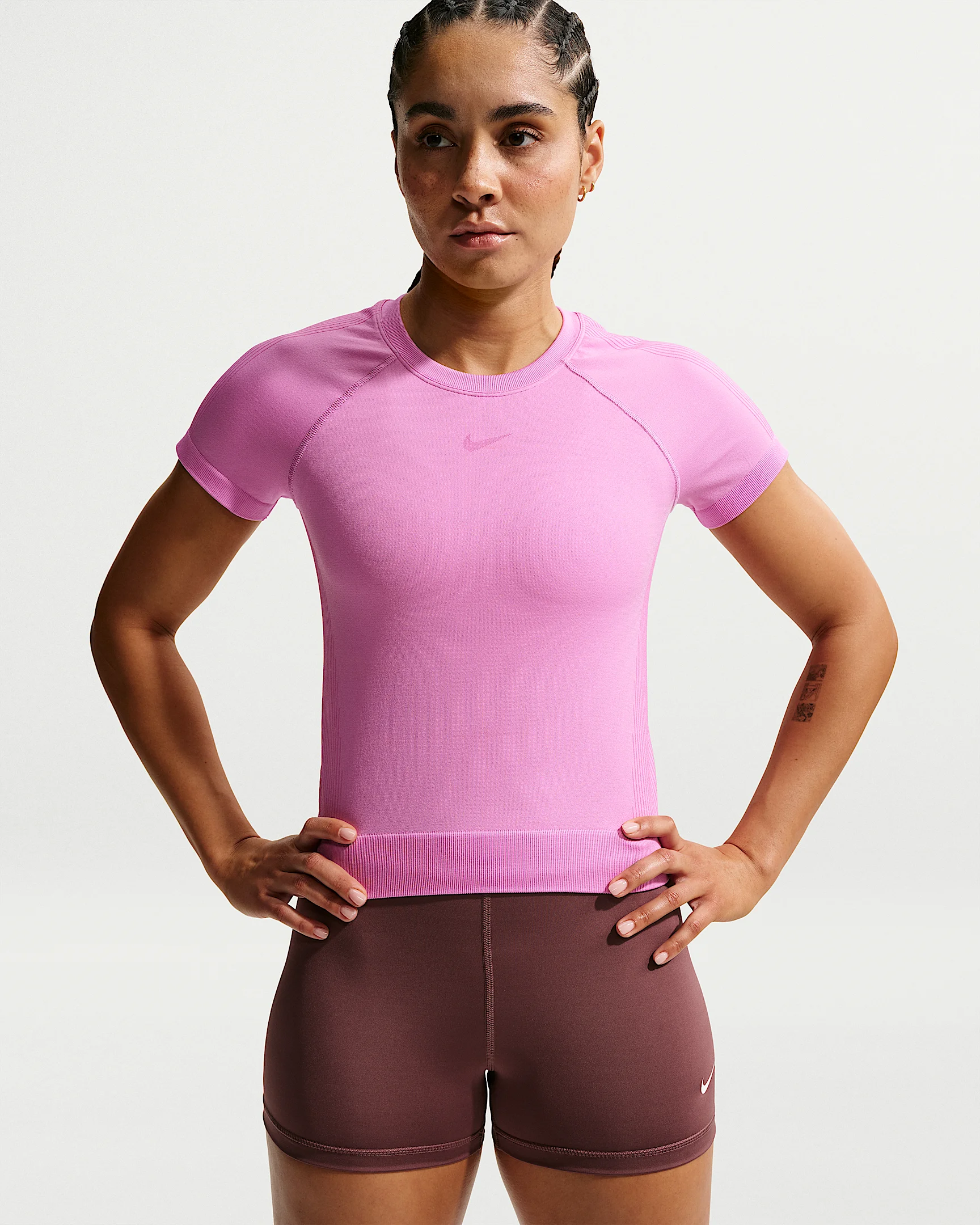 Your favorite go-to gym essential now has a seamless look. Lightweight and stretchy, this tee features soft fabric which dries quickly to help you stay ready when your workout heats up. Benefits - Nike Dri-FIT technology moves sweat away from your skin for quicker evaporation, helping you stay dry and comfortable. - Soft and stretchy fabric has strategically placed ribbed zones for shaping. Product Details - 46% polyester/42% nylon/12% spandex - Machine Wash - Imported - Shown: Light Magenta - Style: IM9972-503 SIZE & FIT Model is wearing size S and is 5′6″168cm Loose fit: roomy and relaxed