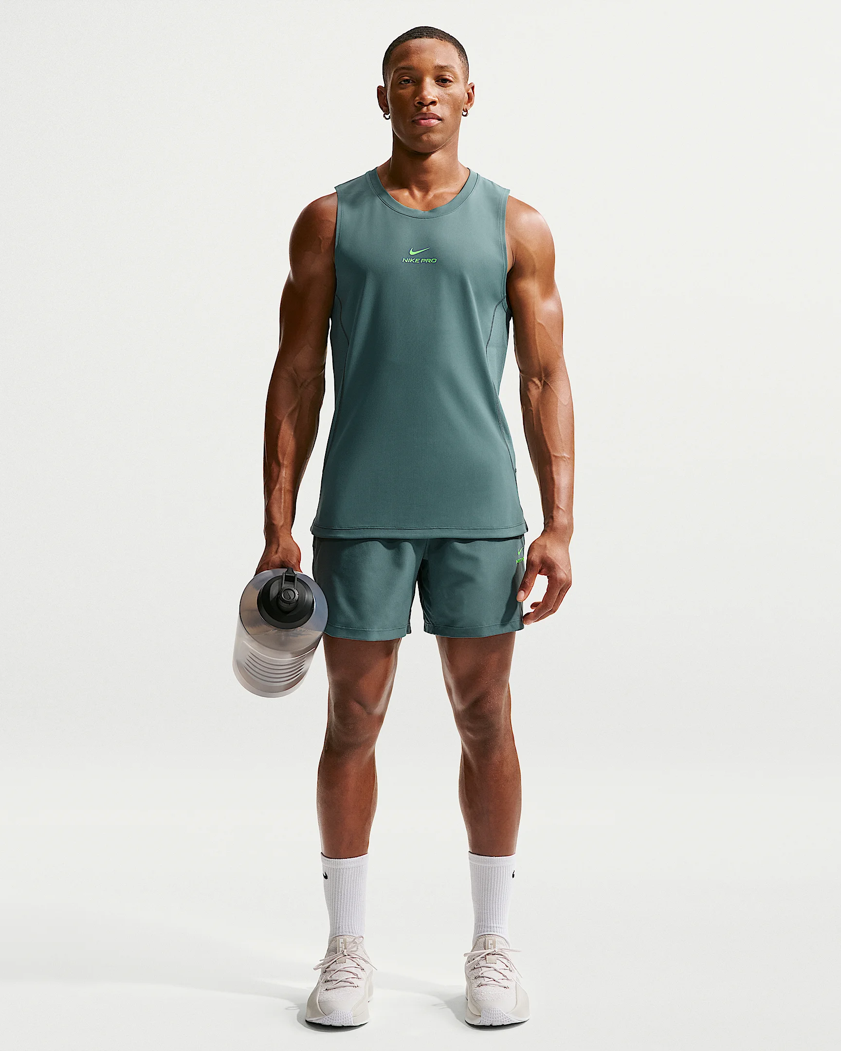 The 6” Nike Pro shorts deliver a smooth, stretchy feel with sweat-wicking Dri-FIT technology to help you stay focused through every rep. Benefits - Nike Dri-FIT technology moves sweat away from your skin for quicker evaporation, helping you stay dry and comfortable. - Zippered pockets and an interior pocket fit your necessities. - Flat elastic waistband with internal drawcord provides a secure fit. - Breathable mesh gusset panel boosts airflow and allows natural movement. - Mesh panels on the upper back and sides enhance breathability for cool, comfortable training. Product Details - 6" inseam - Body: 89% polyester/11% spandex. Mesh: 100% polyester. - Machine wash - Imported - Shown: Mineral Slate/Green Strike - Style: HV0411-382 SIZE & FIT Model is wearing size M and is 5′11″179cm Standard fit: easy and traditional
