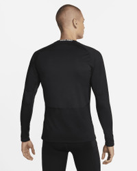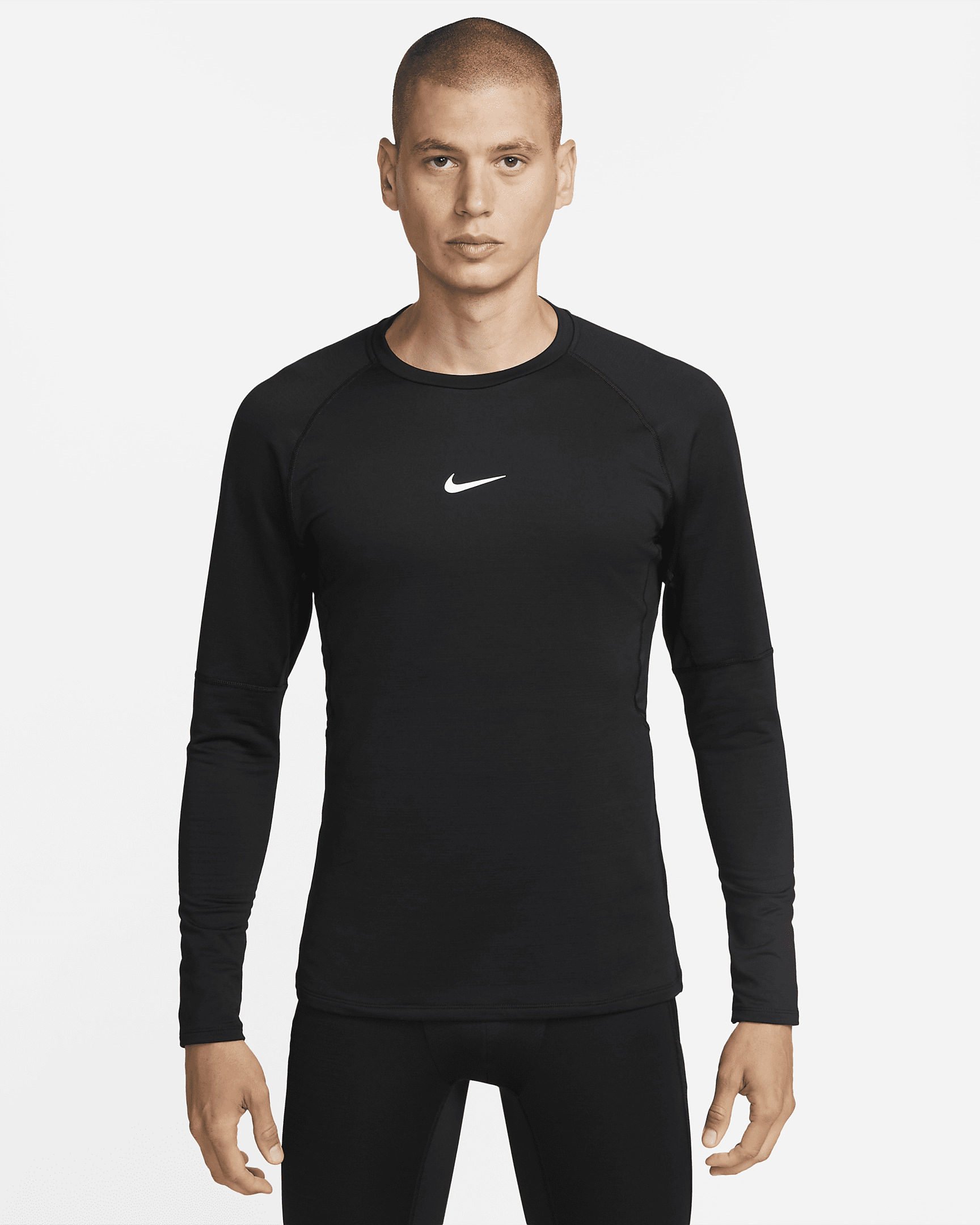 There's no need to dread your workout when the cold weather hits thanks to the Nike Pro Warm collection. This long-sleeve crew is made with soft and stretchy French terry and breathable panels to help you stay comfortable during your favorite sports and activities. Nike Dri-FIT technology moves sweat away from your skin for quicker evaporation, helping you stay dry and comfortable. A round hem offers security when you tuck the shirt in and gives you more coverage when it's left untucked. Product Details - Body: 88% polyester/12% spandex. Rib: 92% polyester/8% spandex. - Machine wash - Imported - Shown: Black/White - Style: FB7982-010 SIZE & FIT Model is wearing size M and is 6′2″188cm Sm fit: sleek and tailored