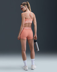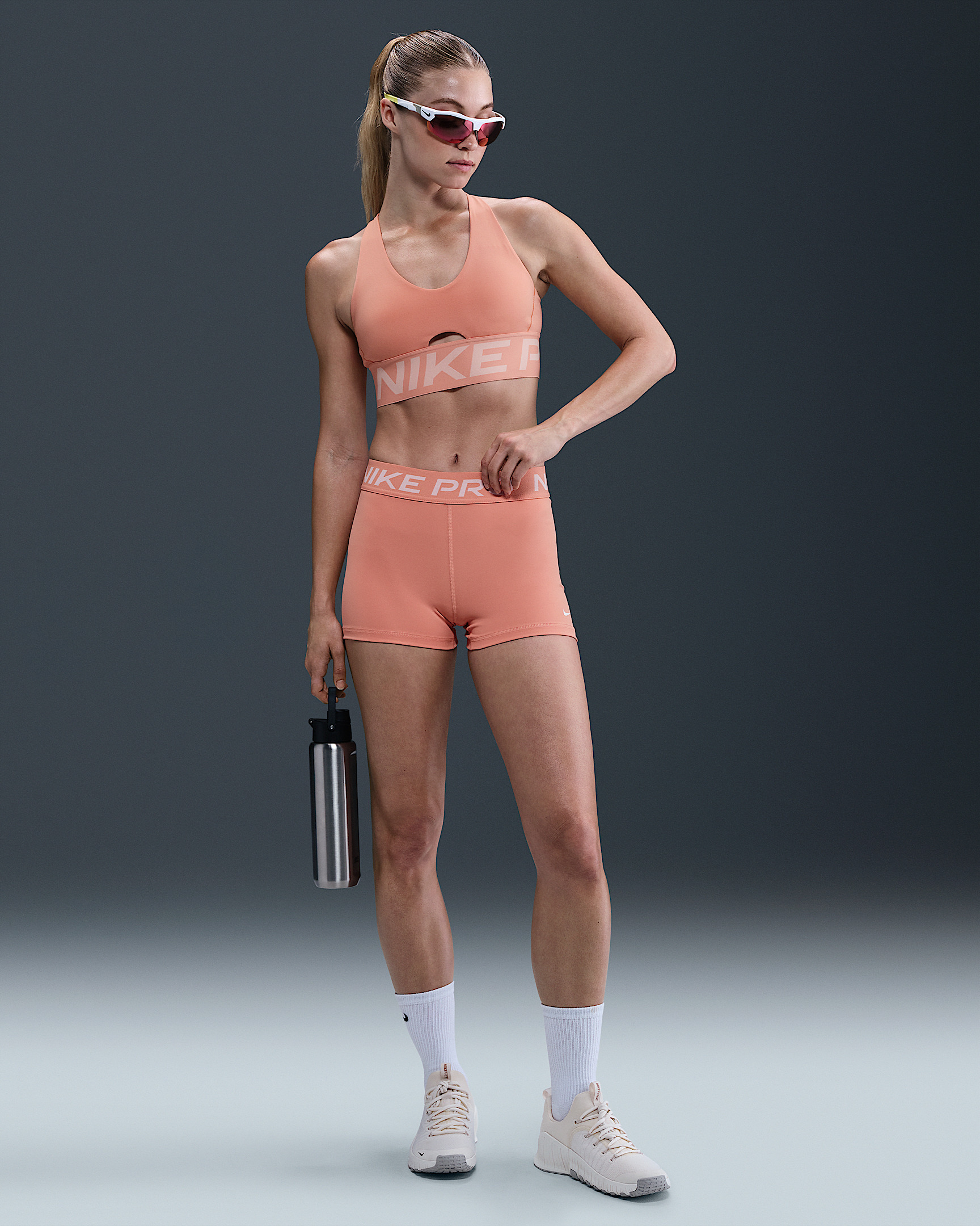 The Nike Pro Shorts are made with stretchy, sleek and supportive fabric that wicks sweat to help you stay dry and comfortable during your workout. This product is made with at least 50% recycled polyester fibers. Benefits - Nike Dri-FIT technology helps you stay dry, comfortable and focused. - A wide, mid-rise elastic waistband feels supportive around your core. Product Details - Tight fit for a body-hugging feel - 78-83% polyester/17-22% spandex - Material percentages may vary. Check label for actual content. - Machine wash - Imported - Shown: Apricot Agate/White - Style: CZ9857-844 SIZE & FIT Model is wearing size S and is 5′11″180cm Tight fit: snug and form-fitting Medium support: feels ke a snug hold to keep everything in place Mid-Rise: sits just below your natural waist (smallest part of your torso)