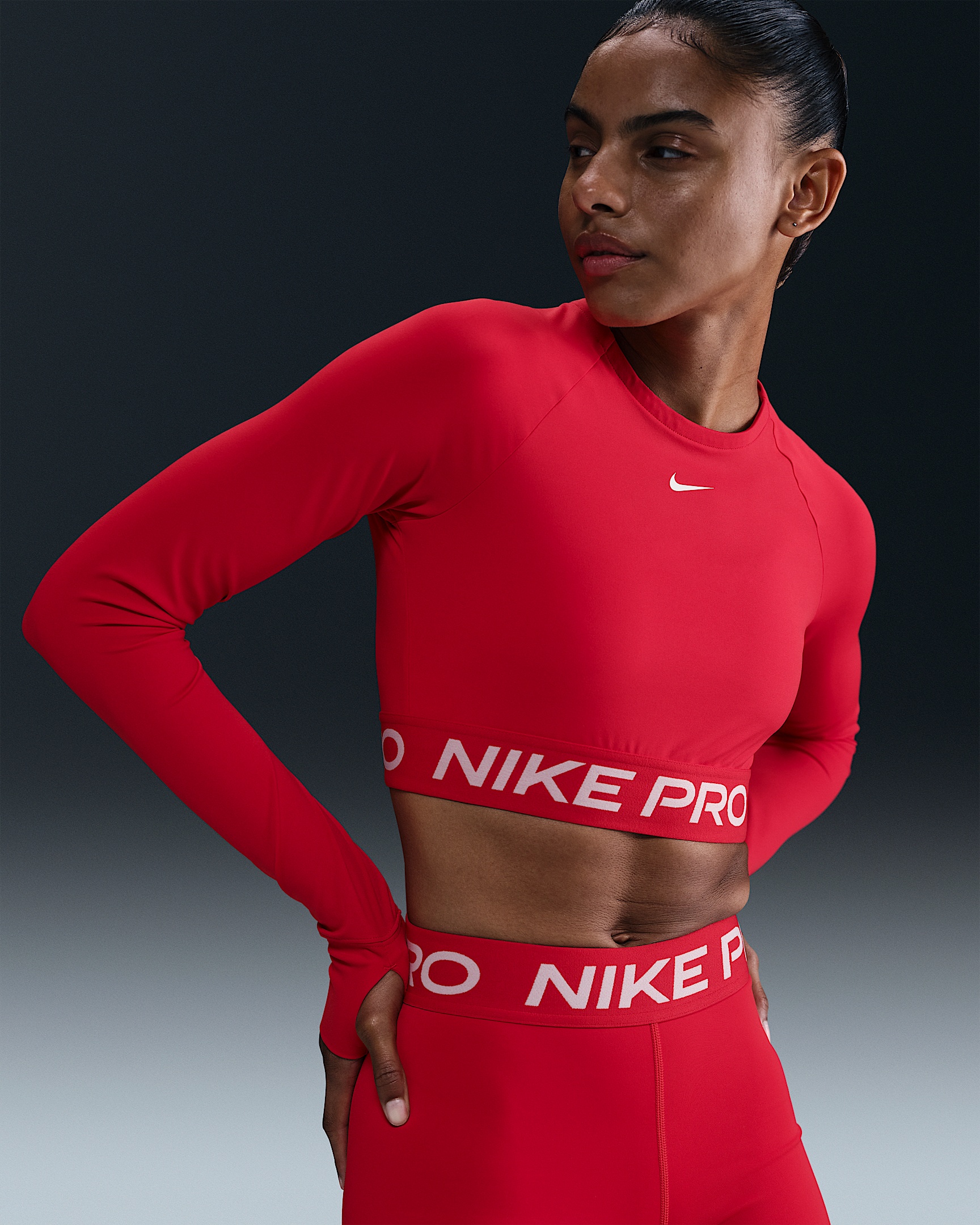 Get your sweat on in this cropped Nike Pro top. Lightweight and stretchy, the smooth fabric dries quickly to help you stay ready when your workout heats up. With a body-hugging fit and soft jacquard elastic band at the hem, you can feel secure as you crush your goals. Product Details - 83% polyester/17% spandex - Machine wash - Imported - Shown: University Red/White - Style: FV5484-657 SIZE & FIT Model is wearing size S and is 5′10″178cm Tight fit: snug and form-fitting