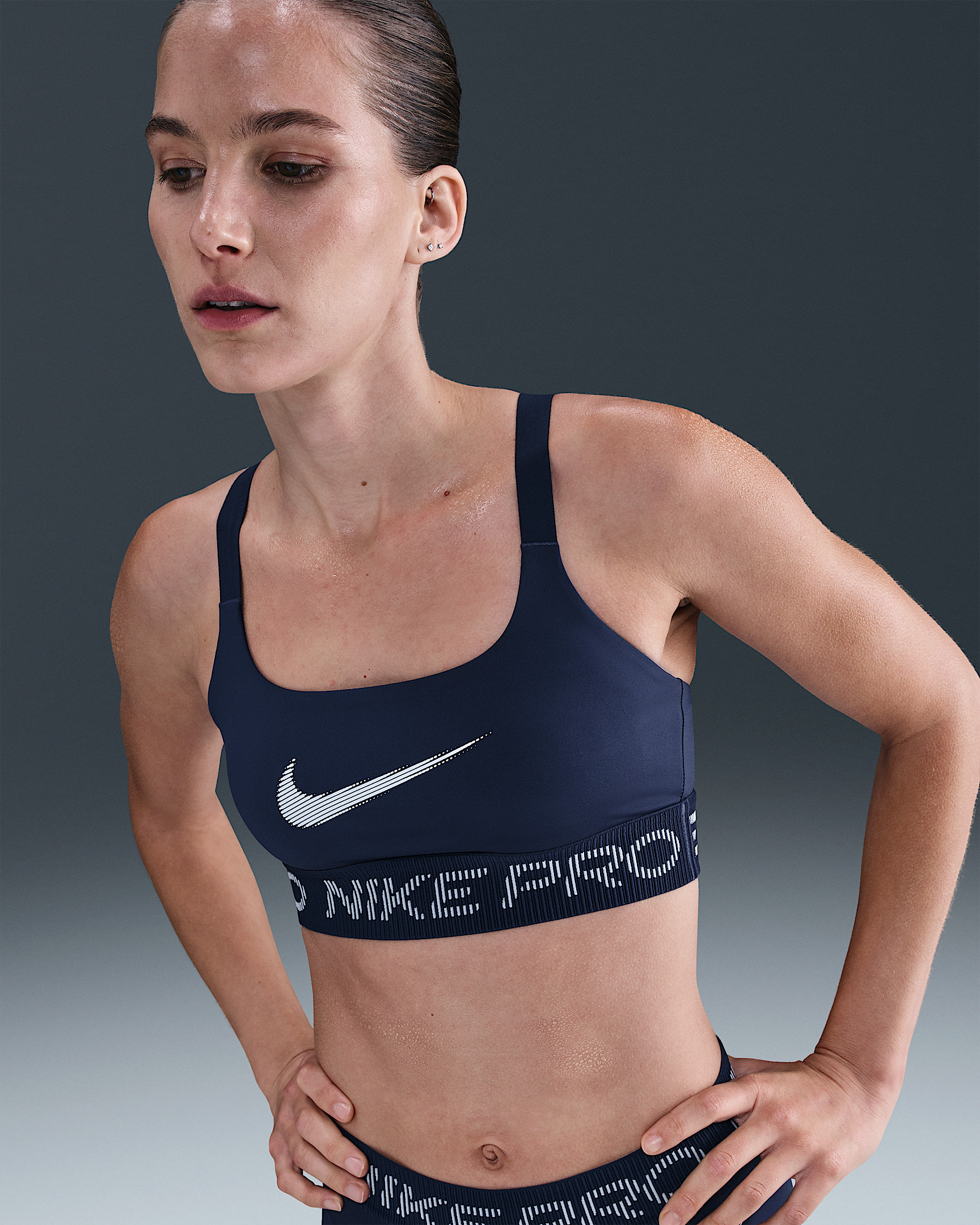 Sweat it out in this Nike Pro sports bra. Lightweight and stretchy, the smooth fabric dries quickly to help you stay comfortable when your workout heats up. A gentle hold and non-padded design gives you plenty of freedom to do you. Product Details - Printed Swoosh logos on front and back - Body/Lining: 83% polyester/17% spandex. Bottom hem: 90% polyester/10% spandex. Straps: 73% nylon/27% spandex. - Machine wash - Imported - Shown: Midnight Navy/Football Grey/White - Style: IF3973-410 SIZE & FIT Model is wearing size S Model height: 5′10″178cm Model bust: 34″86cm Tight fit: snug and form-fitting Light support: feels ke a soft hug with plenty of freedom
