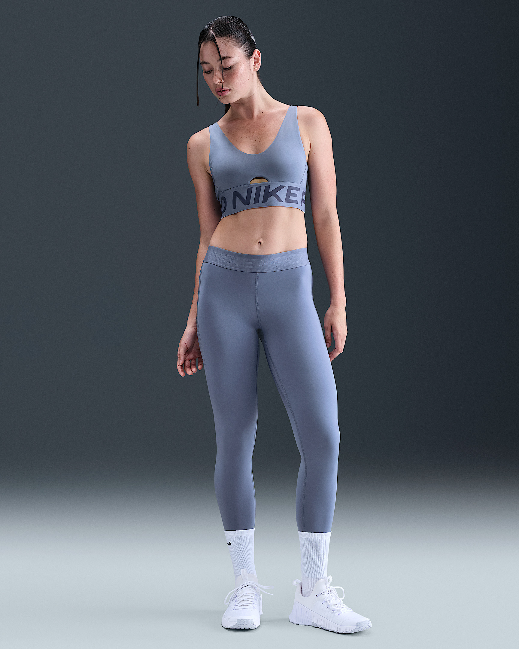 Lightweight and stretchy, these smooth Nike Pro leggings dry quickly to help you stay cool when your workout heats up. Silicone graphics on the thighs add dimension. Product Details - 78-83% polyester/17-22% spandex - Material percentages may vary. Check label for actual content. - Machine wash - Imported - Shown: World Indigo/White - Style: HV2348-499 SIZE & FIT Model is wearing size S and is 5′9″175cm Tight fit: snug and form-fitting Medium support: feels ke a snug hold to keep everything in place Fl length: hits below ankle Mid-Rise: sits just below your natural waist (smallest part of your torso)