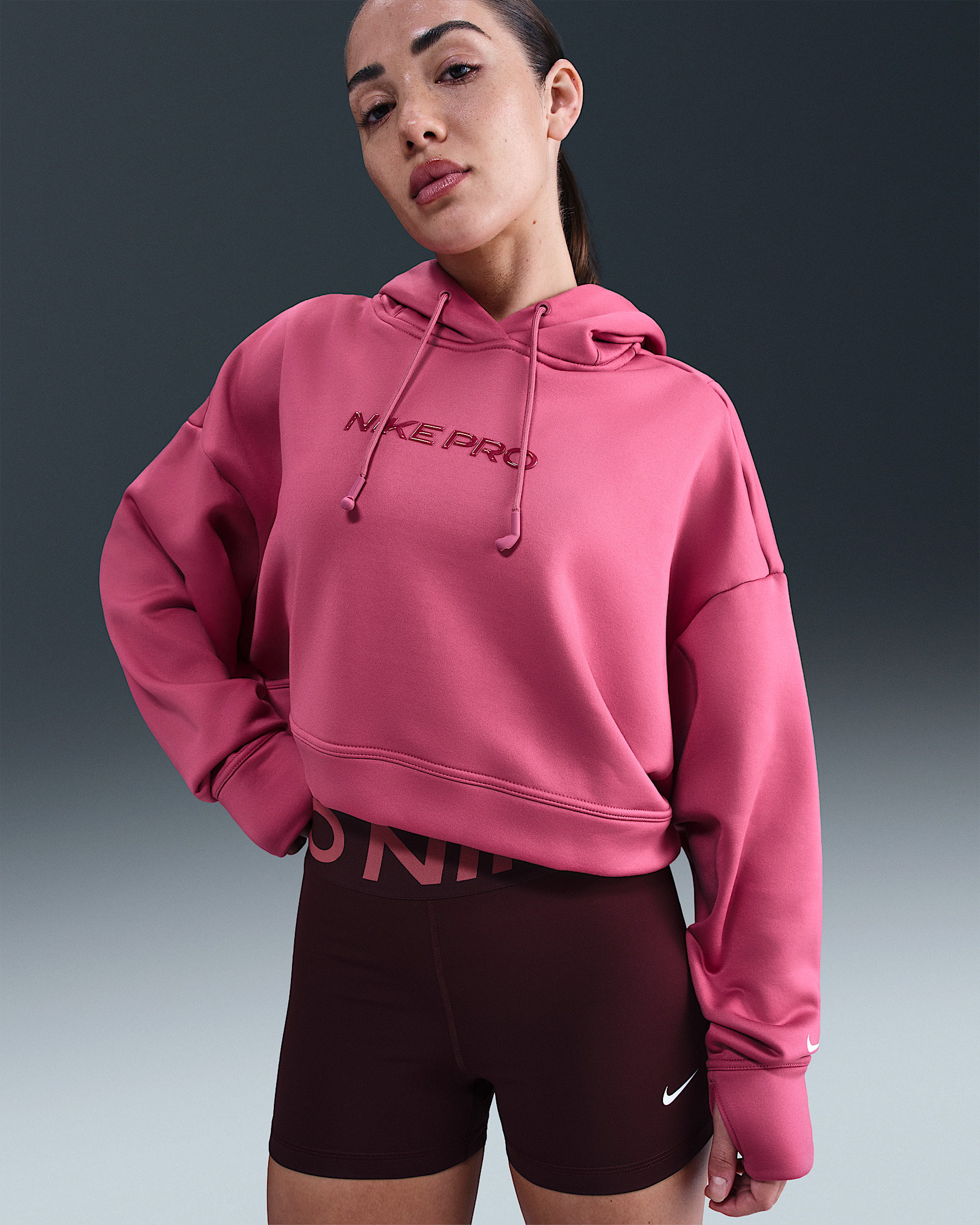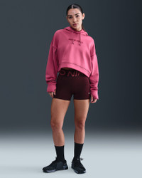 Warm up and work out in this spacious, heat-regulating hoodie. Soft and stretchy fabric feels cozy thanks to its supersmooth face on the outside and soft brushed face on the inside. Silicon drawcord tips provide a place to hold your earbuds. Product Details - Swoosh logo on sleeve - Nike Pro branding at chest - Thumbholes on sleeves - Body: 91% polyester/9% spandex. Hood Lining: 75% polyester/13% cotton/12% rayon. - Machine wash - Imported - Shown: Sweet Beet/White - Style: HV3600-634 SIZE & FIT Model is wearing size S and is 5′6″168cm Oversized fit: exaggerated and spacious