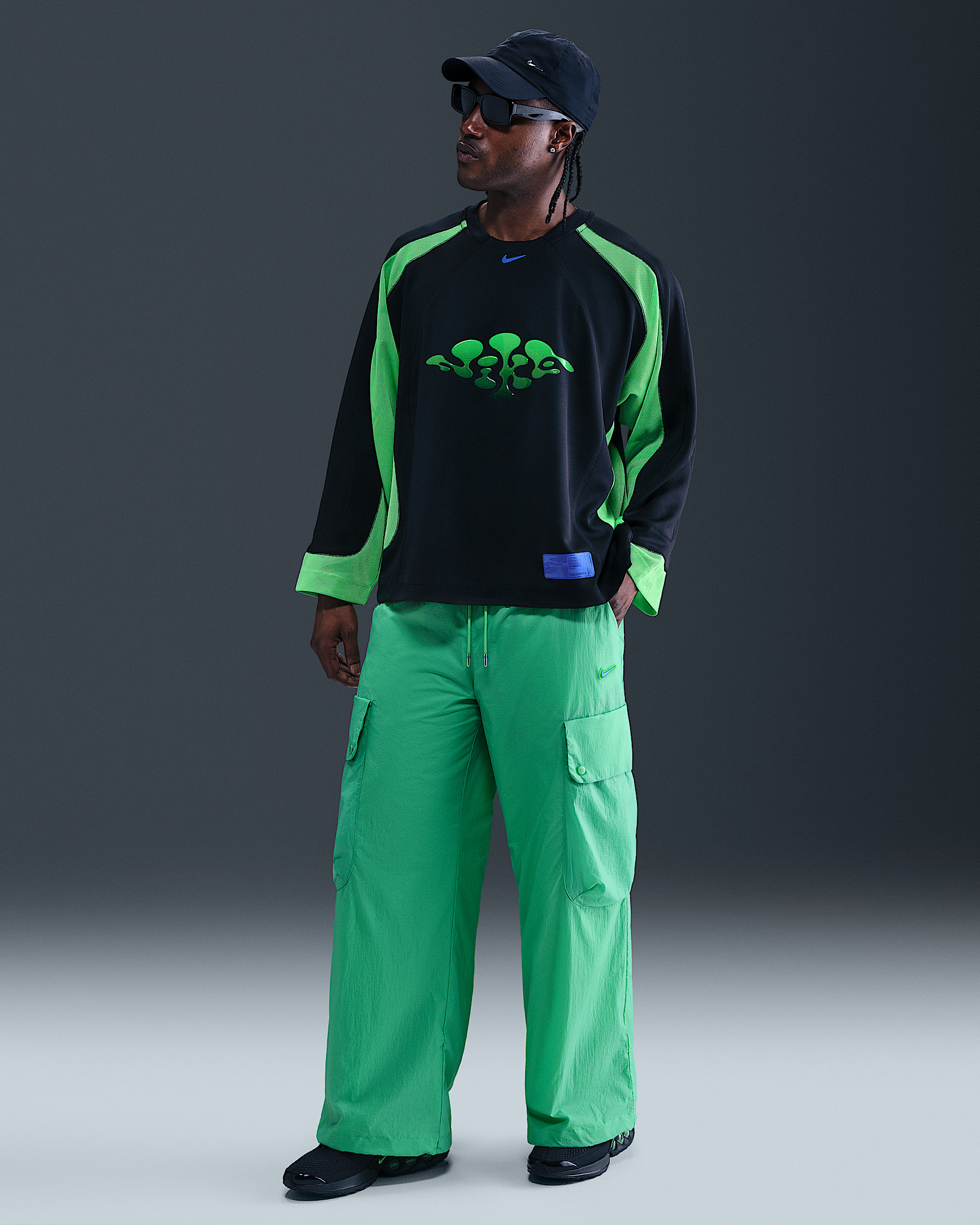 These expressive oversized cargos are crafted with a lightweight, semi-transparent ripstop that repels water. Elastic bungees offer flexibility with styling around your shoes. Benefits - Oversized fit is extra roomy through the seat and thighs. - Water-repellent finish helps keep you dry in wet weather. - An elastic waistband and external drawcord let you draw in a perfect fit. - Large cargo pockets have snap closures. Product Details - Silicone Nike Project F.R.O.G. branding - Hand pockets - Body: 100% nylon; Lining: 100% polyester. - Machine wash - Imported - Shown: Green Shock/Hyper Royal/White/Hyper Royal - Style: HV0907-388