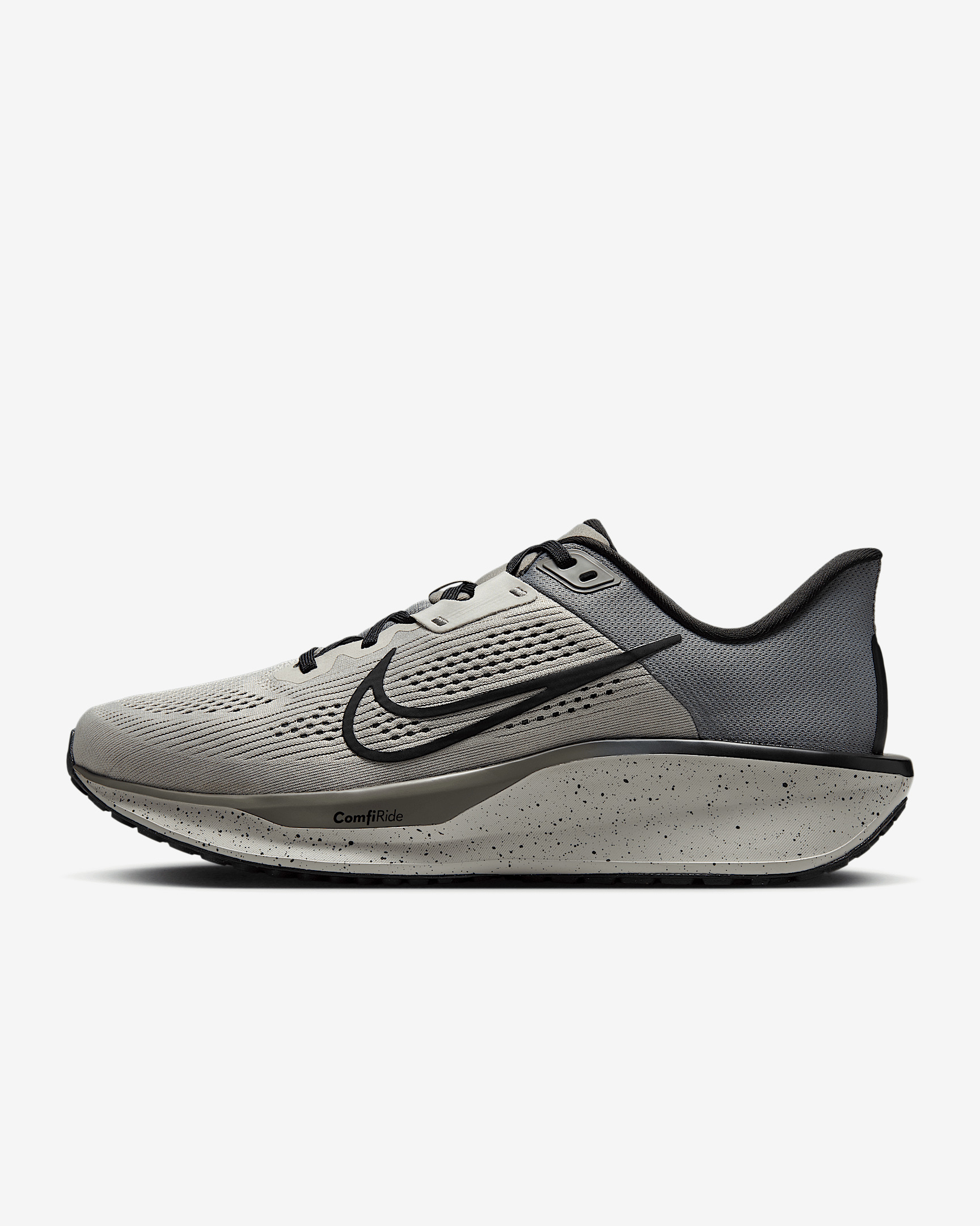 The Nike Quest 6 is for runners of all levels. But make no mistake, it's anything but entry-level. A supercomfortable and supportive midfoot fit band helps keep you stable for your miles. Plus, a supersoft midsole foam helps cushion each step. Benefits - Midfoot fit band helps keep your foot more secure the tighter your laces are. - Increased midsole height means a softer and more responsive ride compared to the Quest 5. - Rubber outsole has the traction to help keep your feet gripped to the pavement. Product Details - Weight: Approx. 295 g/10.4 oz (Men's US 10) - Heel-to-toe drop: 10 mm - Shown: Light Iron Ore/Flat Pewter/Black - Style: IB4002-014