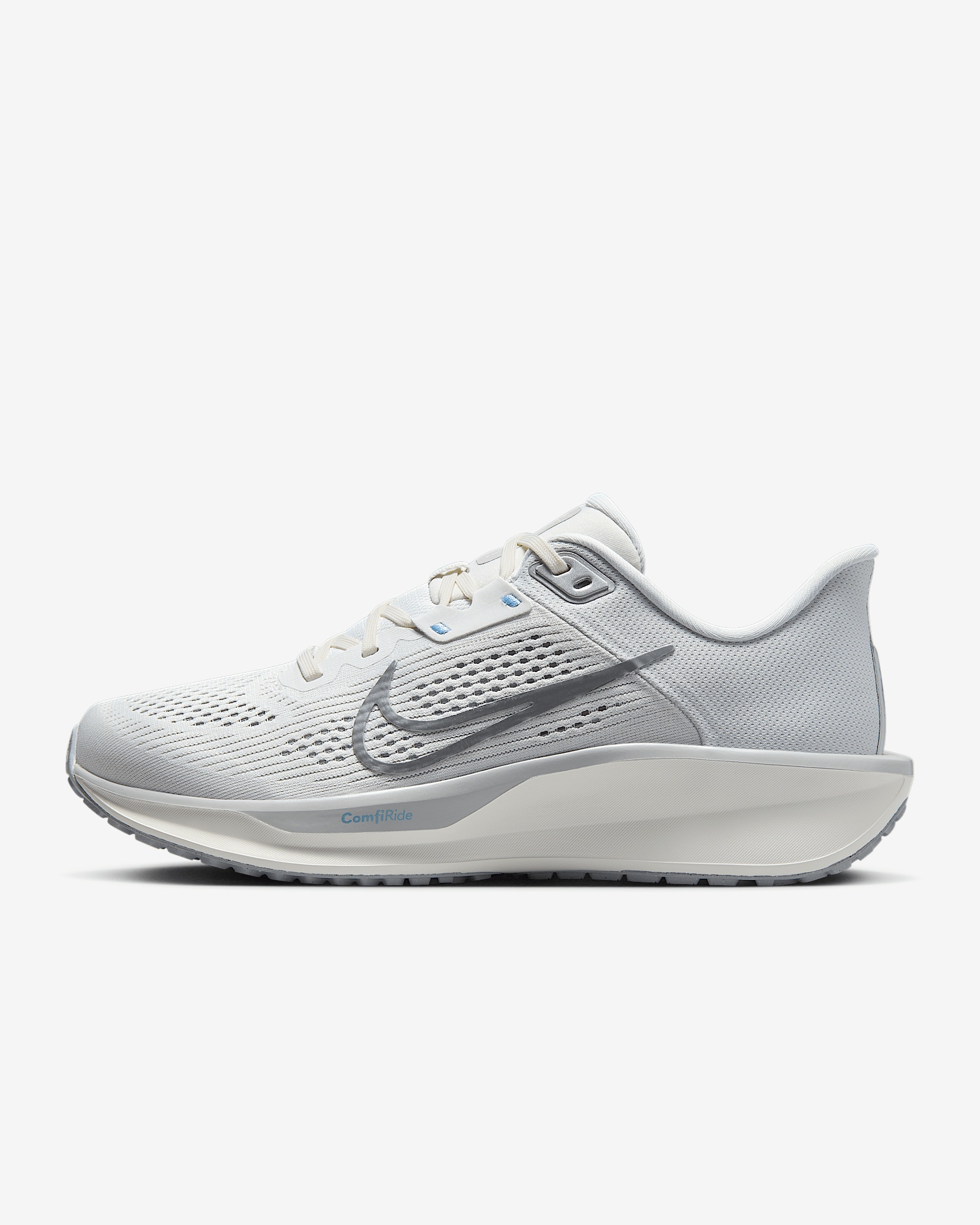 The Nike Quest 6 is for runners of all levels. But make no mistake, it's anything but entry-level. A supercomfortable and supportive midfoot fit band helps keep you stable for your miles. Plus, a supersoft midsole foam helps cushion each step. Benefits - Midfoot fit band helps keep your foot more secure the tighter your laces are. - Increased midsole height means a softer and more responsive ride compared to the Quest 5. - Rubber outsole has the traction to help keep your feet gripped to the pavement. Product Details - Weight: Approx. 247 g/8.7 oz (Women’s US 8) - Heel-to-toe drop: 10 mm - Shown: Photon Dust/Psychic Blue/Summit White/Light Smoke Grey - Style: FD6034-007