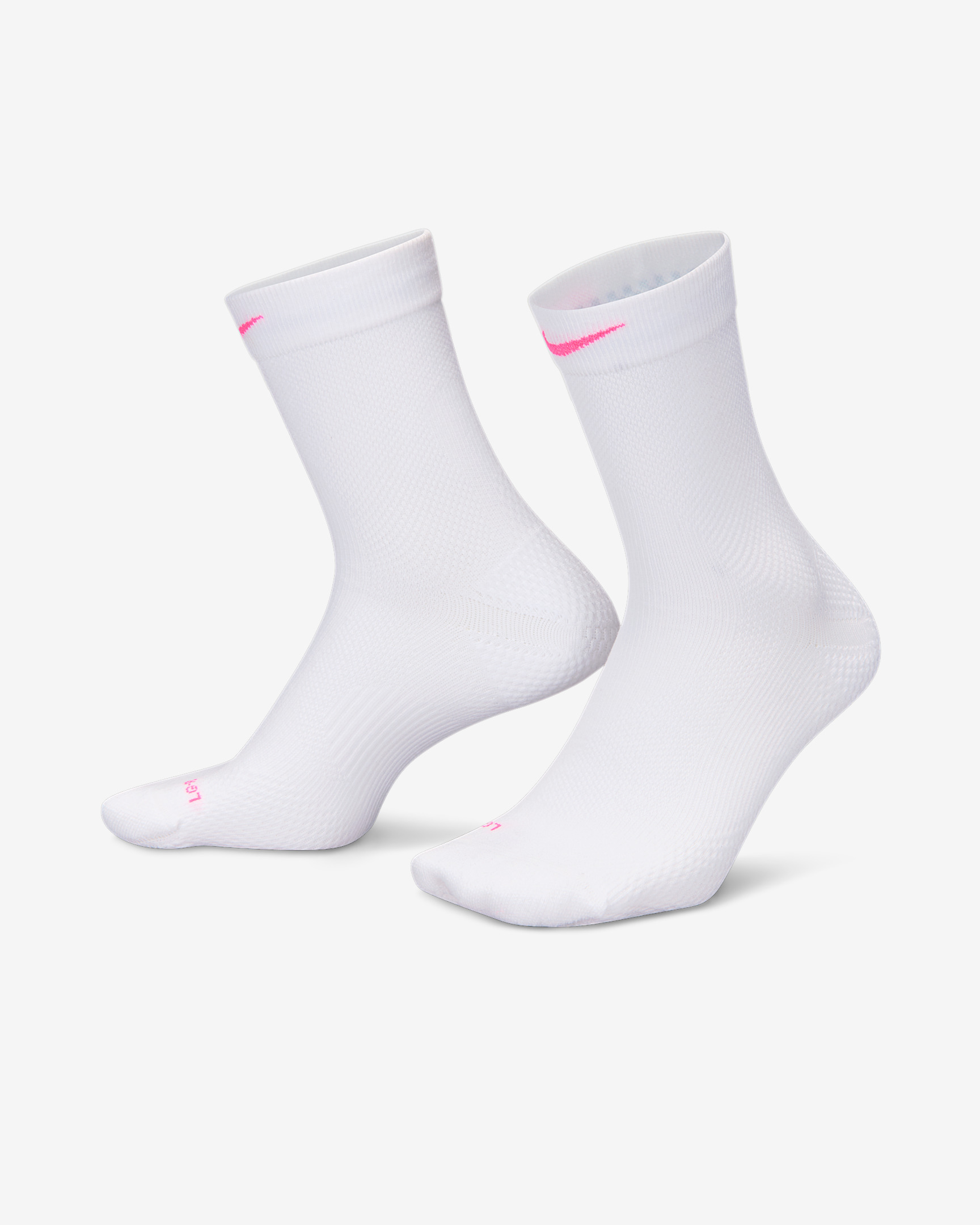 Introducing Nike's newest running socks. Designed to give you a locked-in fit, they feature advanced sweat-wicking technology and strategically placed cushioning and support. This means you can forget the fit and focus on your miles. Plus, there are no tails on the inside, helping to ensure you can run with zero distractions. Product Details - Reflective Details - Not intended for use as Personal Protective Equipment (PPE) - 52% nylon/44% polyester/4% spandex - Machine wash - Imported - Shown: White/Black/Pure Platinum/Hyper Pink - Style: IB6114-101