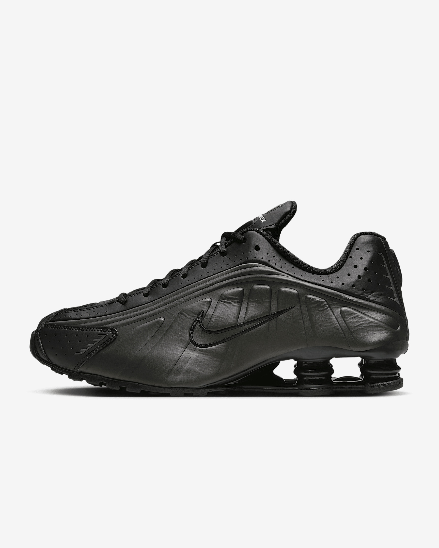 A recrafted version of the early 2000s icon, the Nike Shox R4 replicates the original with its futuristic design lines and performance-like cushioning. Nike Shox columns in the heel distribute weight to maximize comfort while providing a bold look on the streets. Benefits - Synthetic and textile upper is soft and durable. - Nike Shox technology features resilient, flexible columns that compress and regain shape for outstanding cushioning. - Modified, circular Waffle outsole offers great traction. - Laser perforations throughout provide ventilation. Product Details - Foam midsole - Rubber outsole - Not intended for use as Personal Protective Equipment (PPE) - Shown: Black/Black/Bright Crimson/Black - Style: HQ1988-001