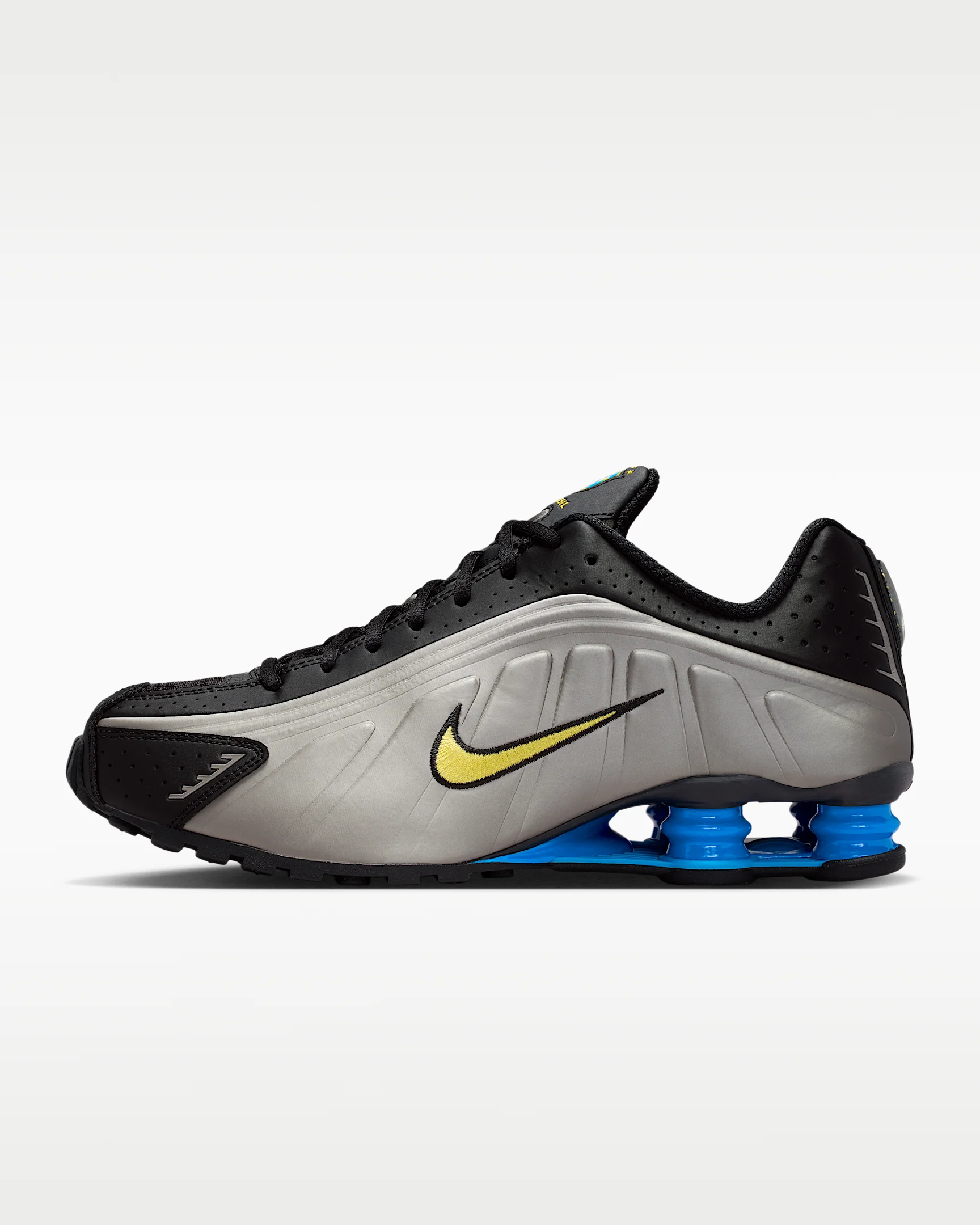 A recrafted version of the 2001 icon, the Shox R4 replicates the original with its synthetic and textile upper, design lines and laser perforations. Nike Shox cushioning in the heel distributes weight to maximize comfort, plus a performance-inspired look. Benefits - Synthetic and textile upper with laser perforations is breathable and durable. - Nike Shox columns provide resilient cushioning. - Modified, circular Waffle outsole gives you durable traction. Product Details - Shown: Black/Metallic Pewter/Light Photo Blue/Canary - Style: IO8134-001