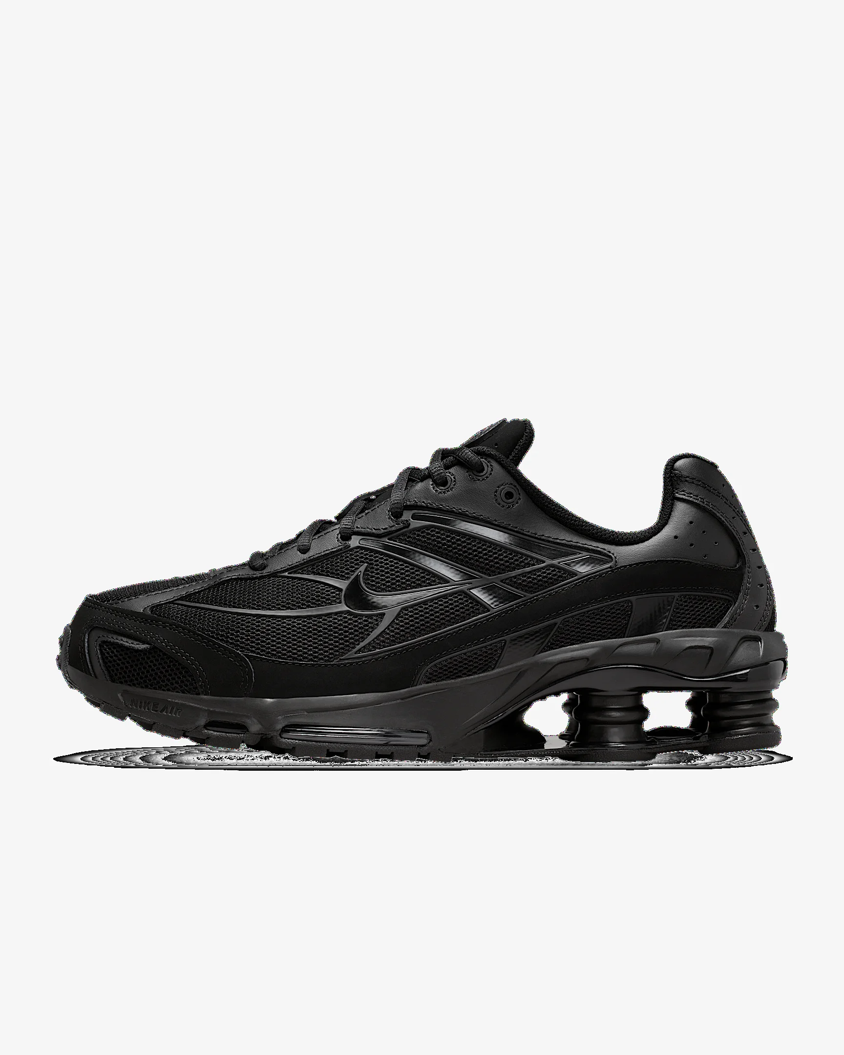 A modern classic, this Nike Shox Ride 2 offers outstanding responsive cushioning with four columns of support under its heel and Max Air technology in the forefoot. And the breathable textile and leather upper is comfortable and durable. Benefits - Plush and comfortable, Max Air cushioning has just the right amount of support. - Leather overlays add durability and a premium finish. Product Details - Foam midsole - Rubber outsole - Shown: Black/Black/Black - Style: IO4296-002