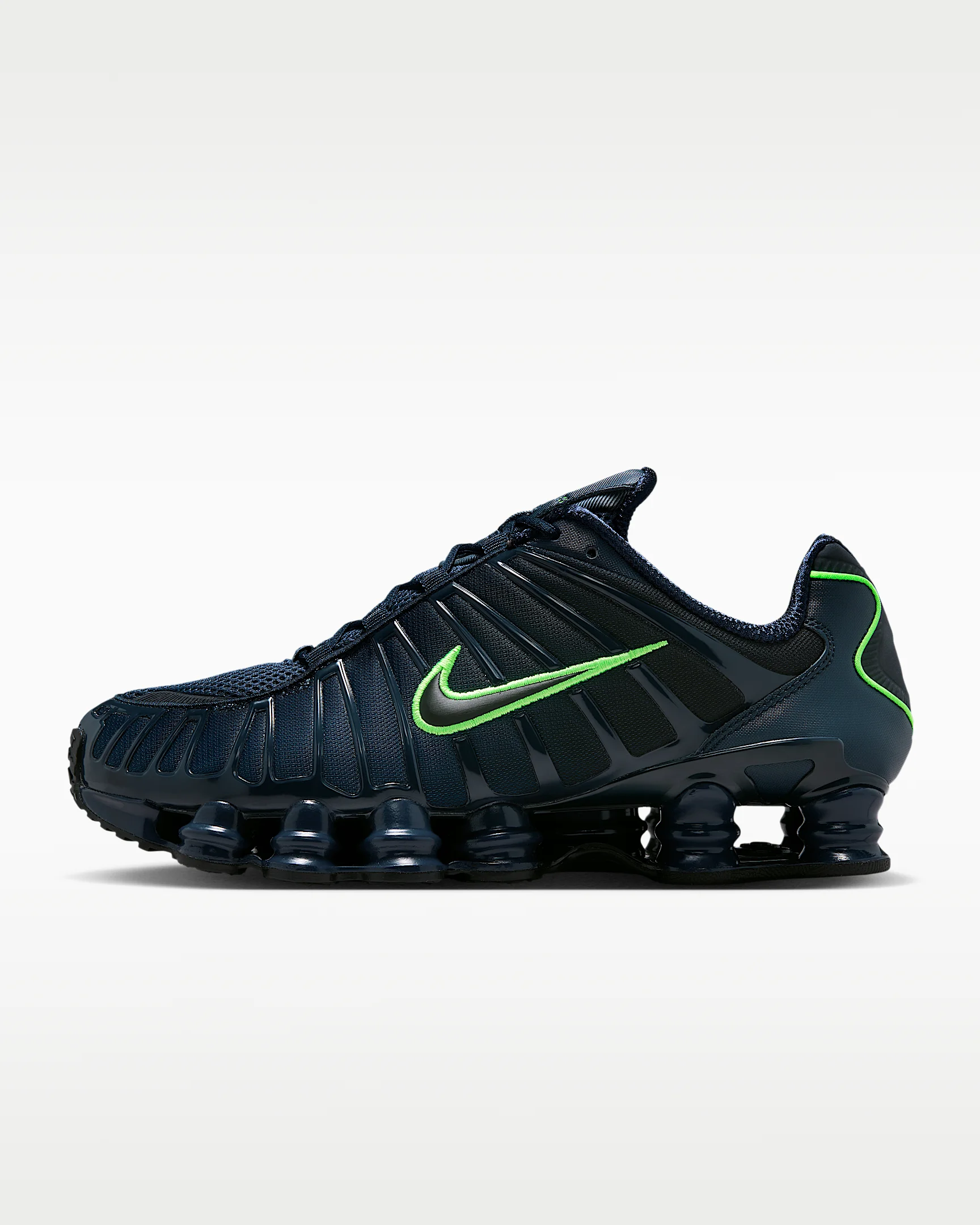 The Nike Shox TL takes mechanical cushioning to the next level. A recrafted version of the 2003 icon, it features breathable mesh in the upper and full-length Nike Shox technology for optimal impact absorption and a bold look on the streets. Benefits - Nike Shox technology combines resilient, flexible columns with moderator plates for outstanding cushioning that compresses and regains its shape. - A combination upper with a full TPU cage is a near-exact replica of the 2003 Nike Shox TL. - Molded overlays throughout the midfoot provide support and a snug fit. - A TPU plate in the heel between the midsole and Nike Shox technology helps provide lateral stability and support. - A foam midsole provides lightweight cushioning. - Non-marking, solid rubber in a modified waffle outsole gives great traction and durability. Product Details - Synthetic and textile upper - Not intended for use as Personal Protective Equipment (PPE) - Shown: Thunder Blue/Obsidian/Green Strike/Black - Style: AV3595-402