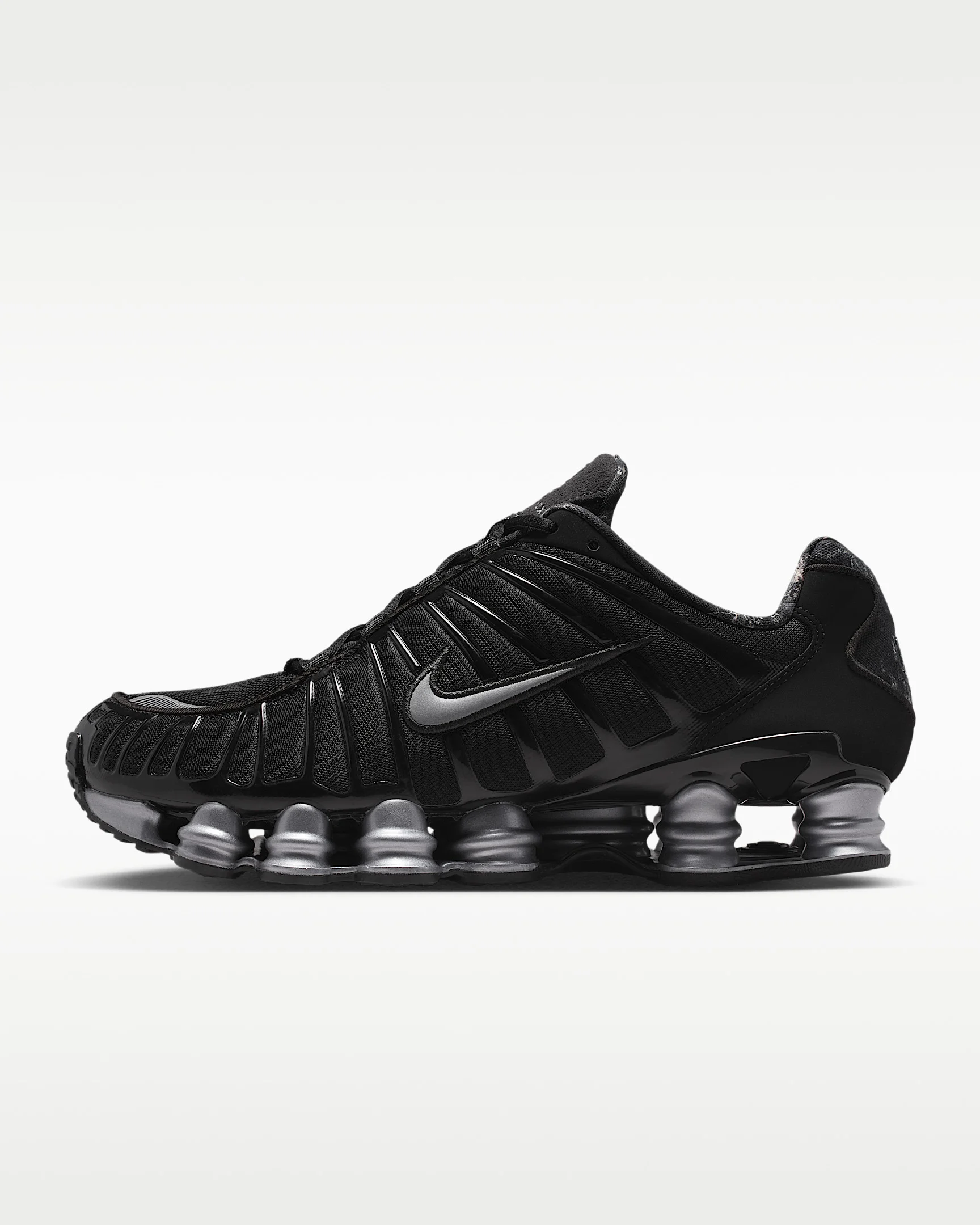 The Nike Shox TL takes mechanical cushioning to the next level. A recrafted version of the 2003 icon, it features breathable mesh in the upper and full-length Nike Shox technology for optimal impact absorption and a bold look on the streets. Benefits - Nike Shox technology combines resilient, flexible columns with moderator plates for outstanding cushioning that compresses and regains its shape. - Combination upper with full TPU cage is near-exact replica of the 2003 Nike Shox TL. - Molded overlays throughout midfoot provide support and snug fit. - TPU plate in heel between midsole and Nike Shox technology helps provide lateral stability and support. Product Details - Foam midsole - Rubber outsole - Shown: Black/Metallic Cool Grey/Dark Smoke Grey - Style: IQ0299-010